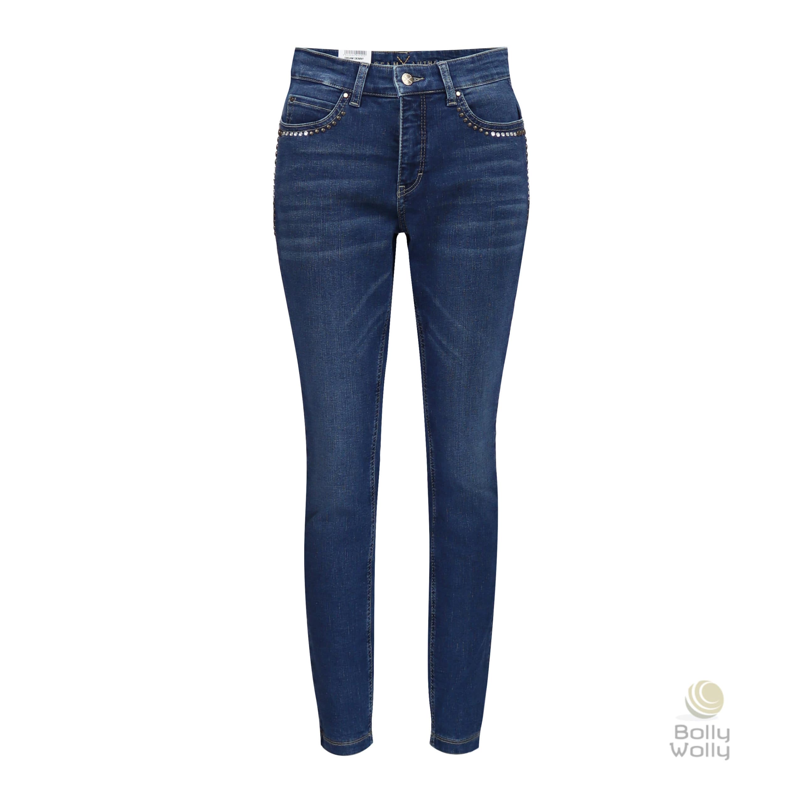 Blauwe jeans van MAC, model Dream Skinny authentic studs, skinny leg. Deze denim broek heeft twee steekzakken aan de voorzijde die versiert zijn met studs, twee achterzakken en sluit met een knoop- en ritssluiting. De jeans is gemaakt van een denim stretch stof en heeft een skinny pasvorm.
