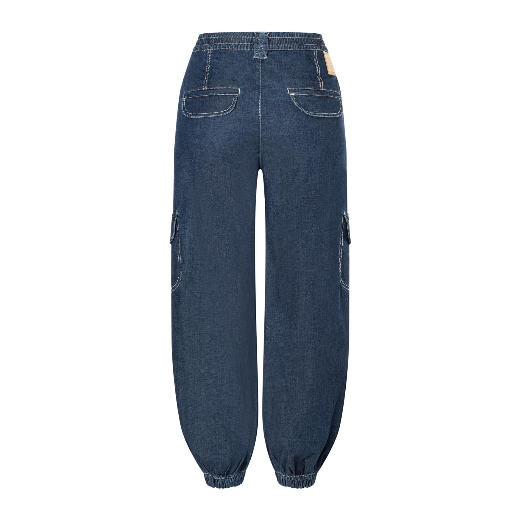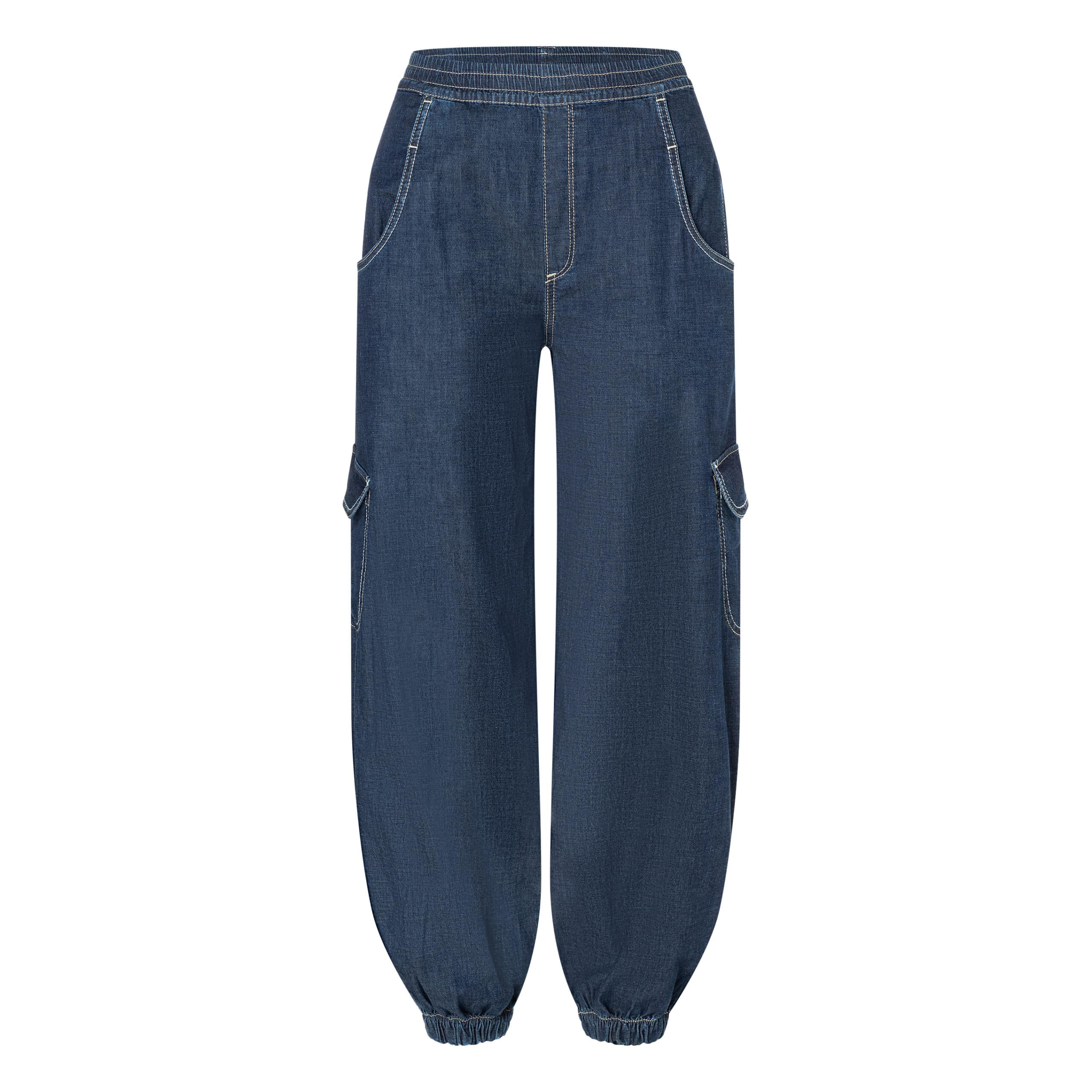 Blauwe cargo jeans van MAC, model Elva Cargo. Deze broek is gemaakt van een dunne denim stretch stof en heeft een relaxte fit. De jeans heeft een elastische taille, twee steekzakken en cargo zakken.