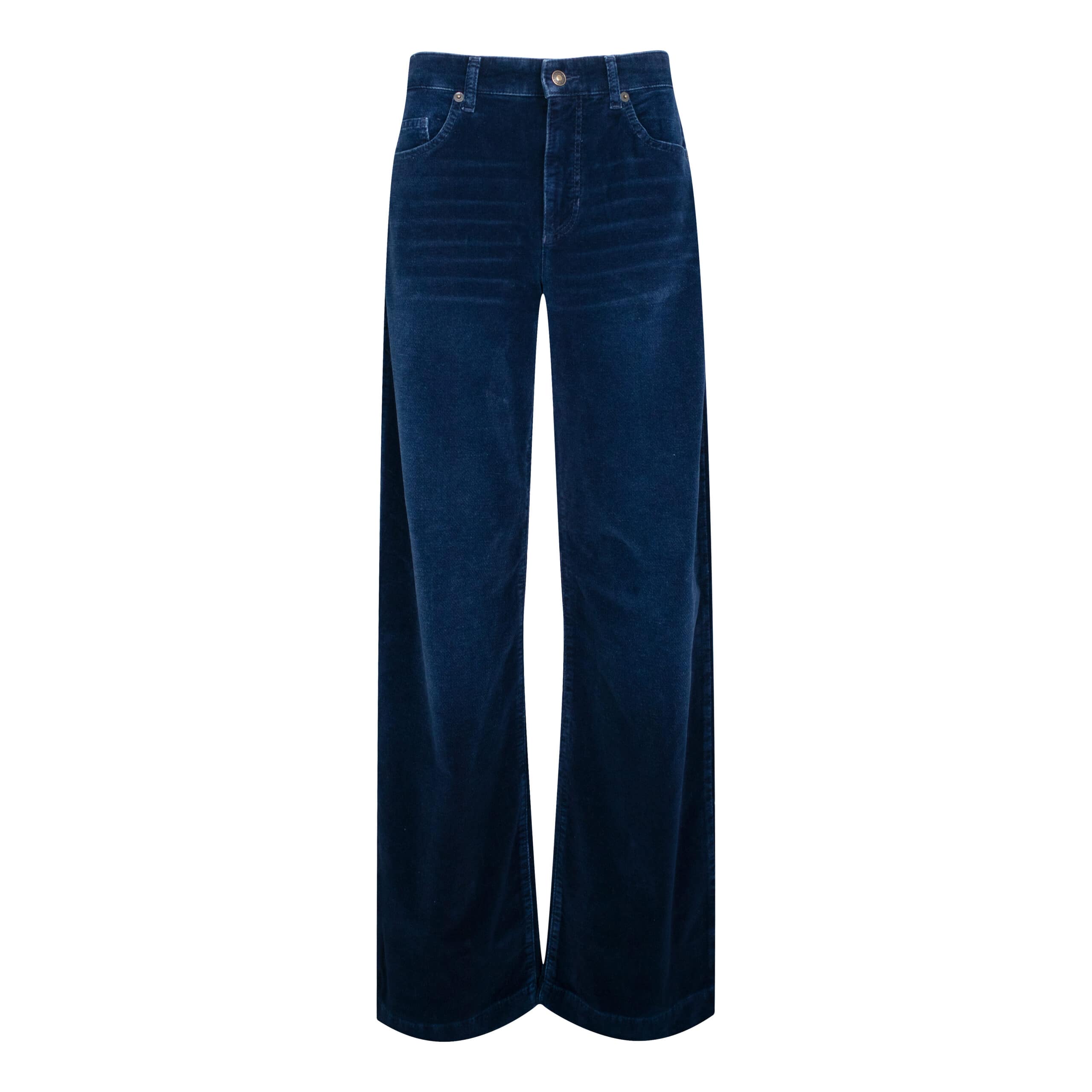 Blauwe fluwelen pantalon van MAC, model Wideleg, highwaist, wide leg. Deze broek is gemaakt van een blauwe fluwelen stretch stof en heeft rechte, wijde broekspijpen. De pantalon sluit met een knoop- en ritssluiting, heeft twee steekzakken en twee sierpaspelzakken.