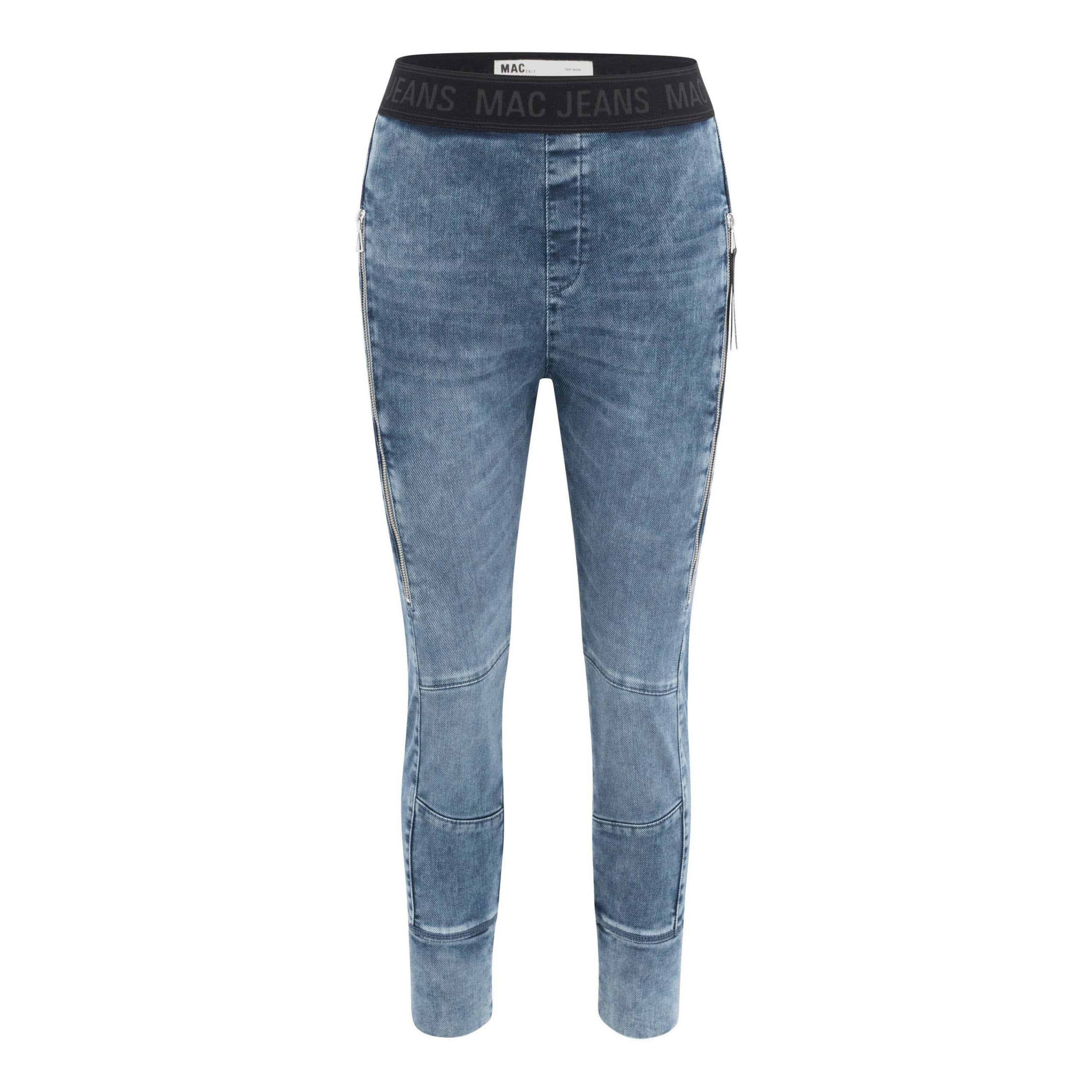 Blauwe jeans van MAC Jeans, model Future 2.0 denim. Deze broek is gemaakt van stretch thermo denim, dat je benen warm houdt, en heeft een elastische tailleband. De broek heeft taps toelopende broekspijpen met twee zakken achter ritsjes aan de voorzijde.