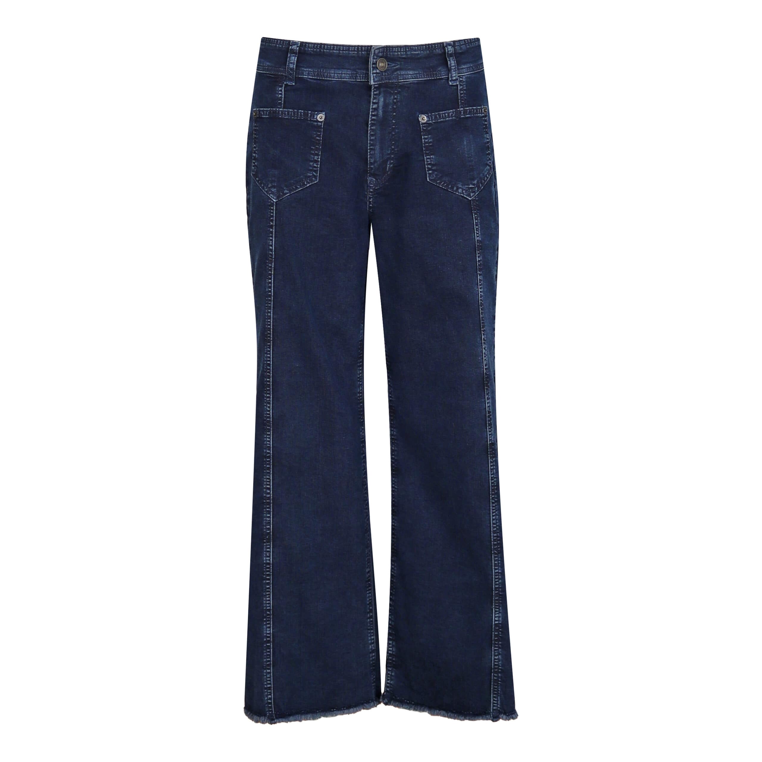 Donkerblauwe jeans van MAC, model Jamie cropped. Deze broek is gemaakt van donkerblauwe stretch denim en heeft rechte, wijde broekspijpen. De broek sluit met een knoop- en ritssluiting, heeft twee pocket zakken, klepzakken aan de achterzijde en een losse pasvorm.