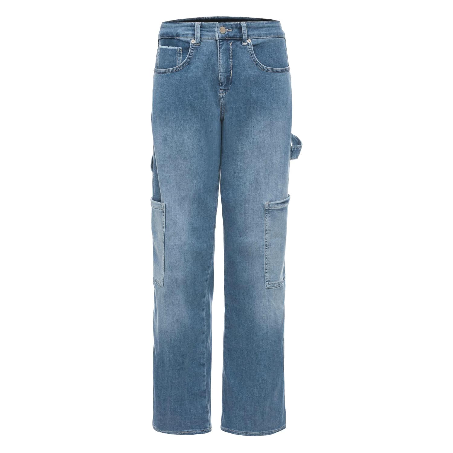 Blauwe jeans van MAC, model Cargo Worker, straight fit, straight leg in mid blue wash. Deze denim broek heeft een hogere taille, twee worker steekzakken aan de zijkant, twee steekzakken, achterzakken en sluit met een knoop- en ritssluiting. De jeans is gemaakt van een denim stretch stof, heeft een recht broekspijpen en twee decoratieve lussen aan de zijkant.