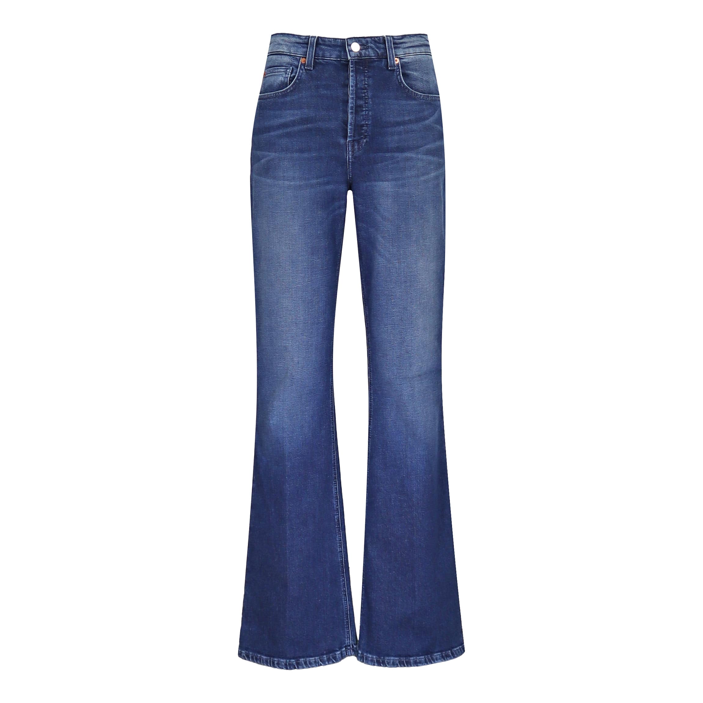 Blauwe jeans van MAC, model Dream Wide authentic galloon. Deze denim broek heeft een hoge taille en wijde broekspijpen die aan de onderzijde uitlopen. De jeans sluit met een knoopssluiting, heeft twee steekzakken en twee achterzakken.