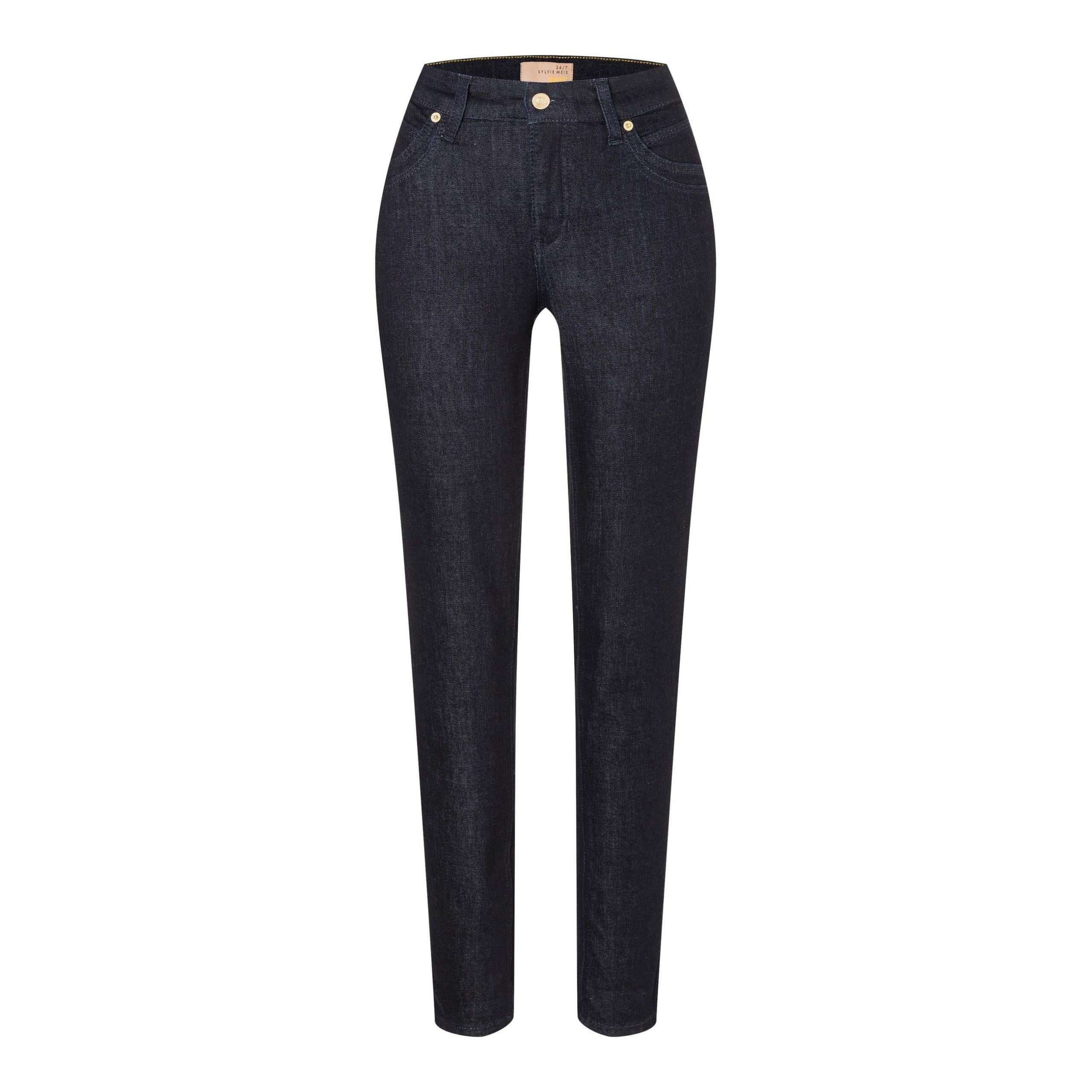 Donkerblauwe jeans van MAC x Sylvie Meis 24/7, model Melanie Pipe feminine fit, slim leg. Deze rechte denim broek heeft twee steekzakken aan de voorzijde en twee achterzakken. De jeans is gemaakt van een denim stretch stof, sluit met een knoop- en ritssluiting en heeft een smalle taille.