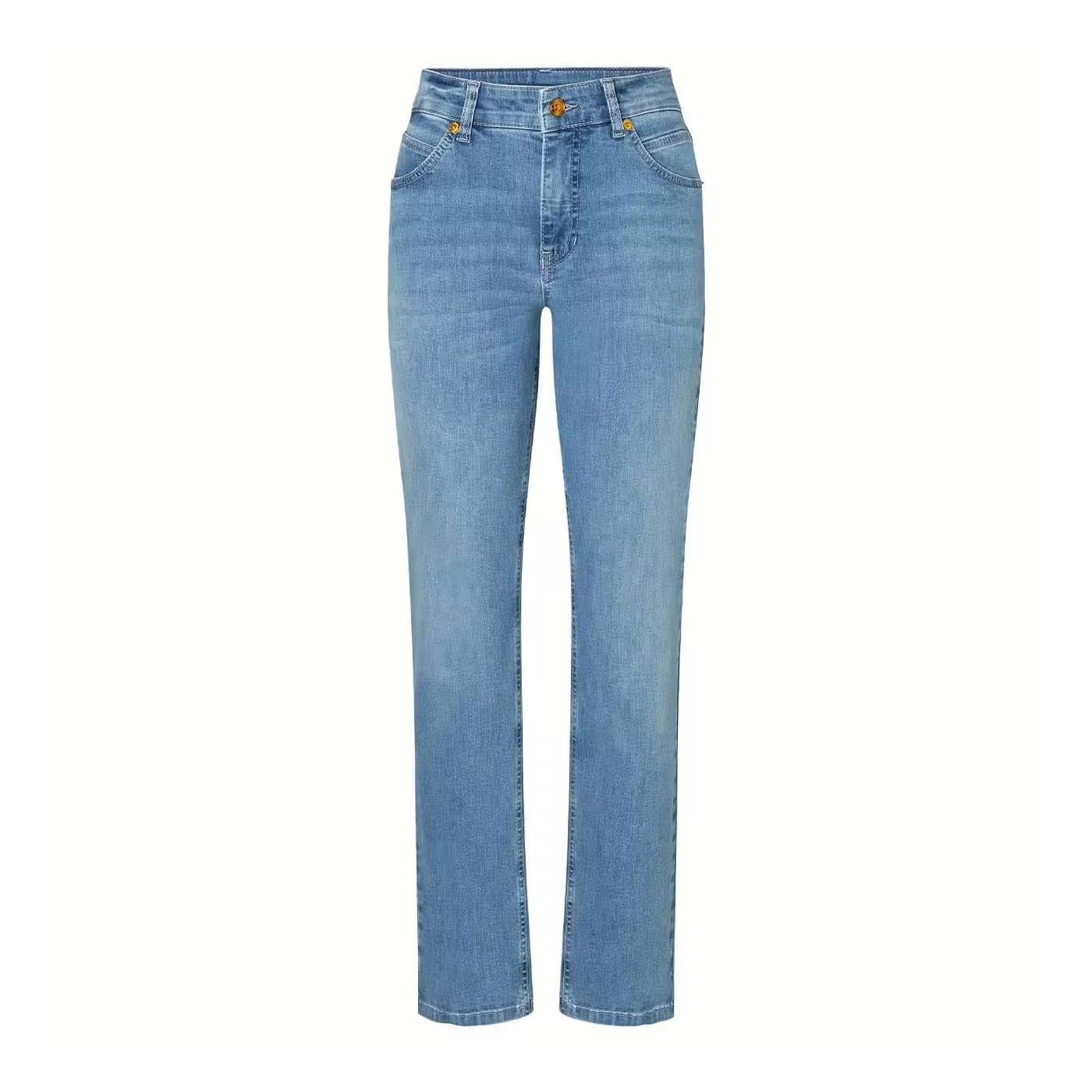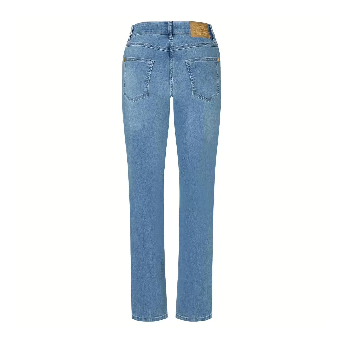 Blauwe jeans van MAC, model Melanie, feminine fit, straight leg in summer light blue. Deze denim broek sluit met een knoop- en ritssluiting, heeft twee steekzakken aan de voorzijde en twee achterzakken. De jeans is gemaakt van een denim stretch stof en heeft een slim fit pasvorm.