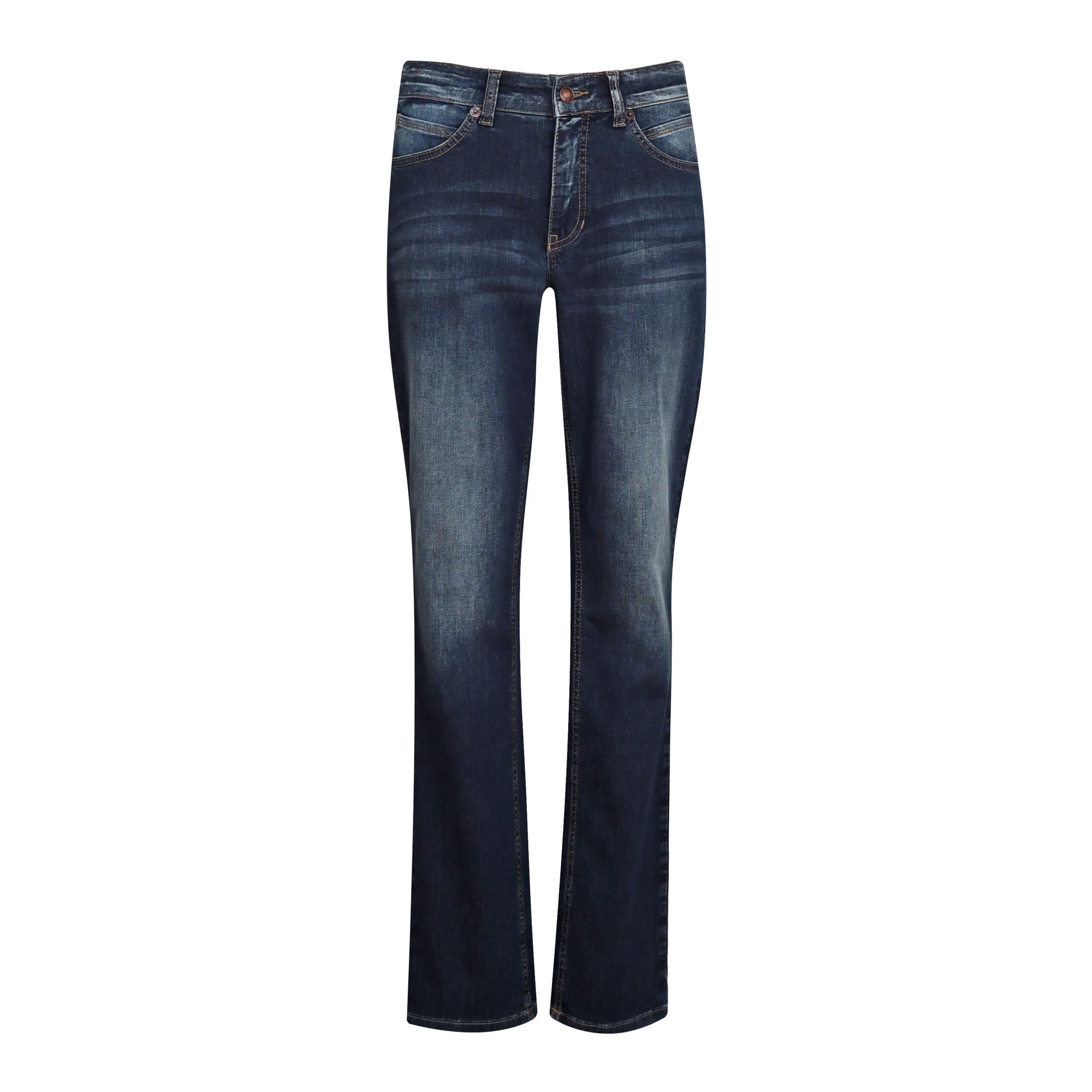 Blauwe jeans van MAC, model Melanie wave glam, feminine fit, straight leg. Deze denim broek heeft rechte broekspijpen, twee steekzakken en twee achterzakken die versiert zijn met kleine studs in de vorm van een golf. De jeans is gemaakt van stretch denim, sluit met een knoop- en ritssluiting en heeft een normale taille.