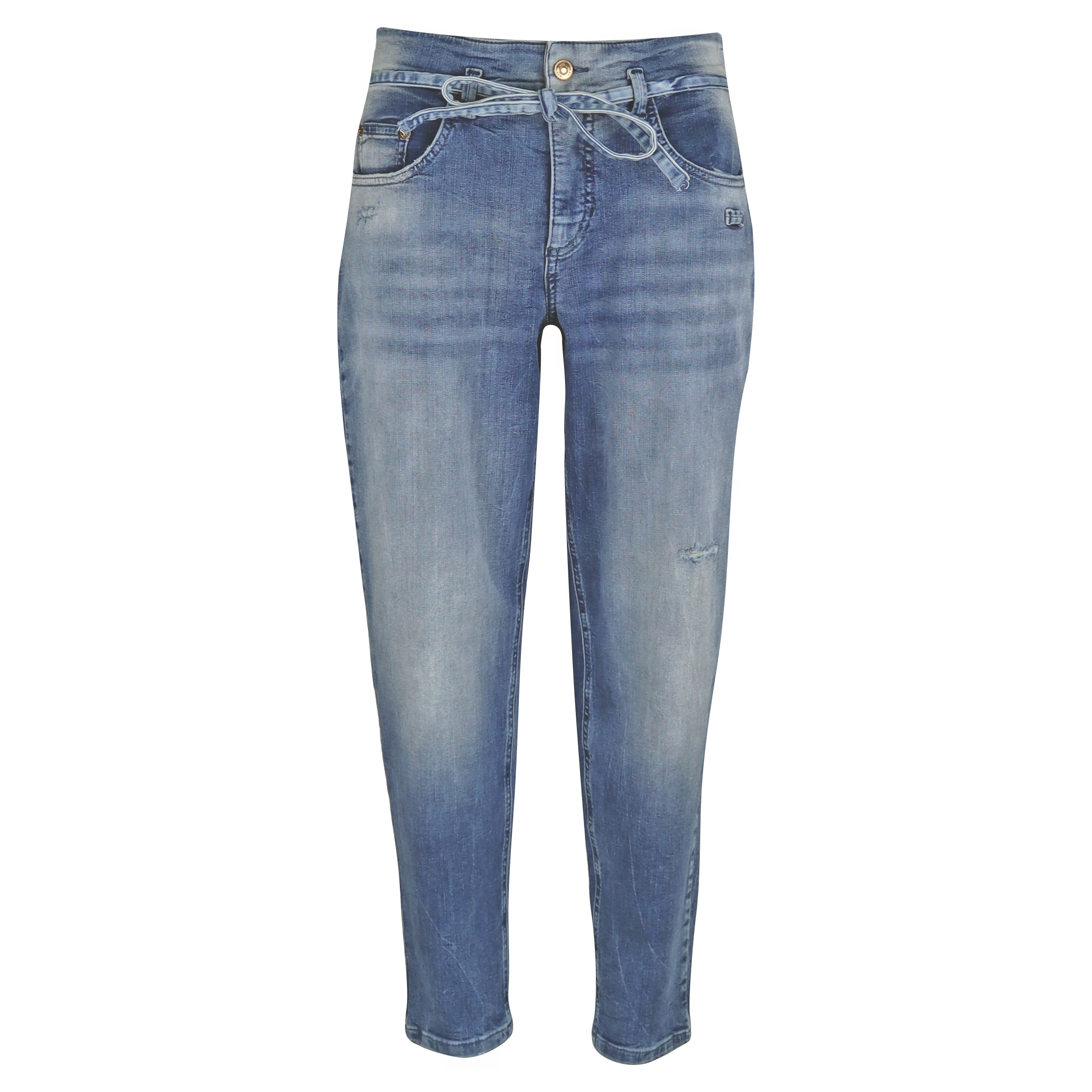Moms fit jeans van MAC Jeans, model Mina. Deze broek heeft een hoge, smalle taille met een denim striklint en toelopende broekspijpen met licht beschadigingen. De jeans sluit met een knoop- en ritssluiting en heeft twee steekzakken en twee achterzakken.