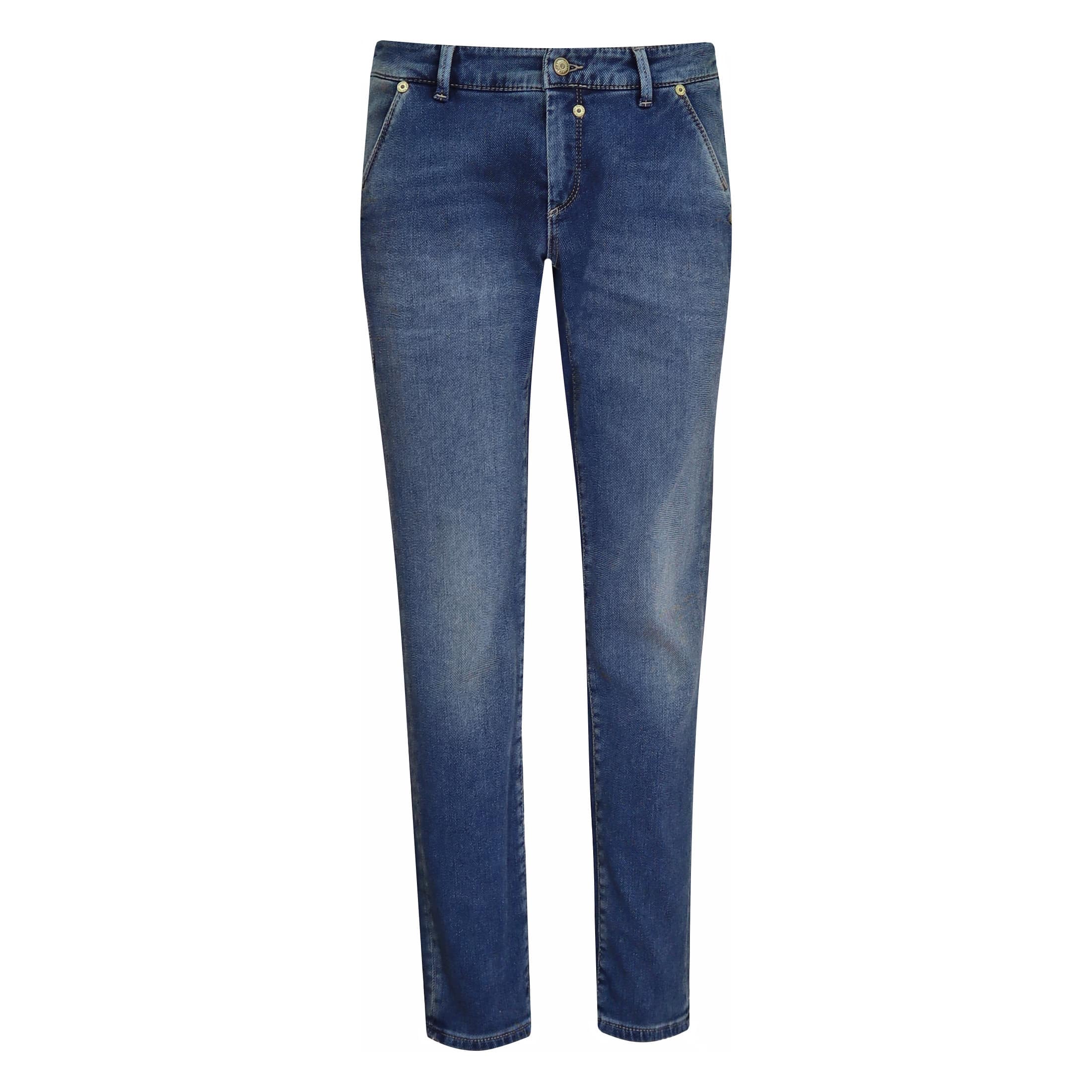 Chino jeans van MAC, model Montana chino, slim leg. Deze spijkerbroek is gemaakt van stretch denim en heeft rechte, smalle broekspijpen. De jeans sluit met een knoop- en ritssluiting, heeft een lagere taille en twee steekzakken en twee achterzakken.