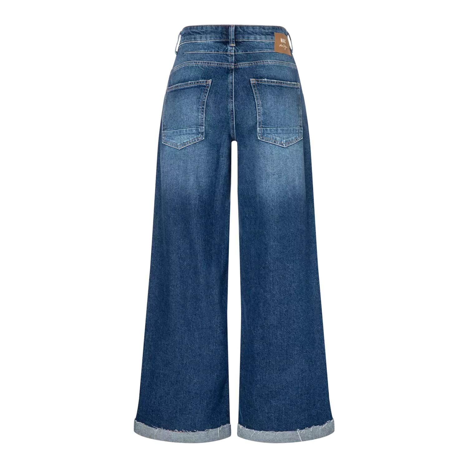 Blauwe jeans van MAC, model Nevada saloon in heavy damaged blue. Deze los vallende broek is gemaakt van denim met beschadigingen en heeft studs bij de steekzakken. De jeans sluit met een zichtbare knoopsluiting, heeft twee steekzakken, twee achterzakken, een vaste omslag en wijde broekspijpen.