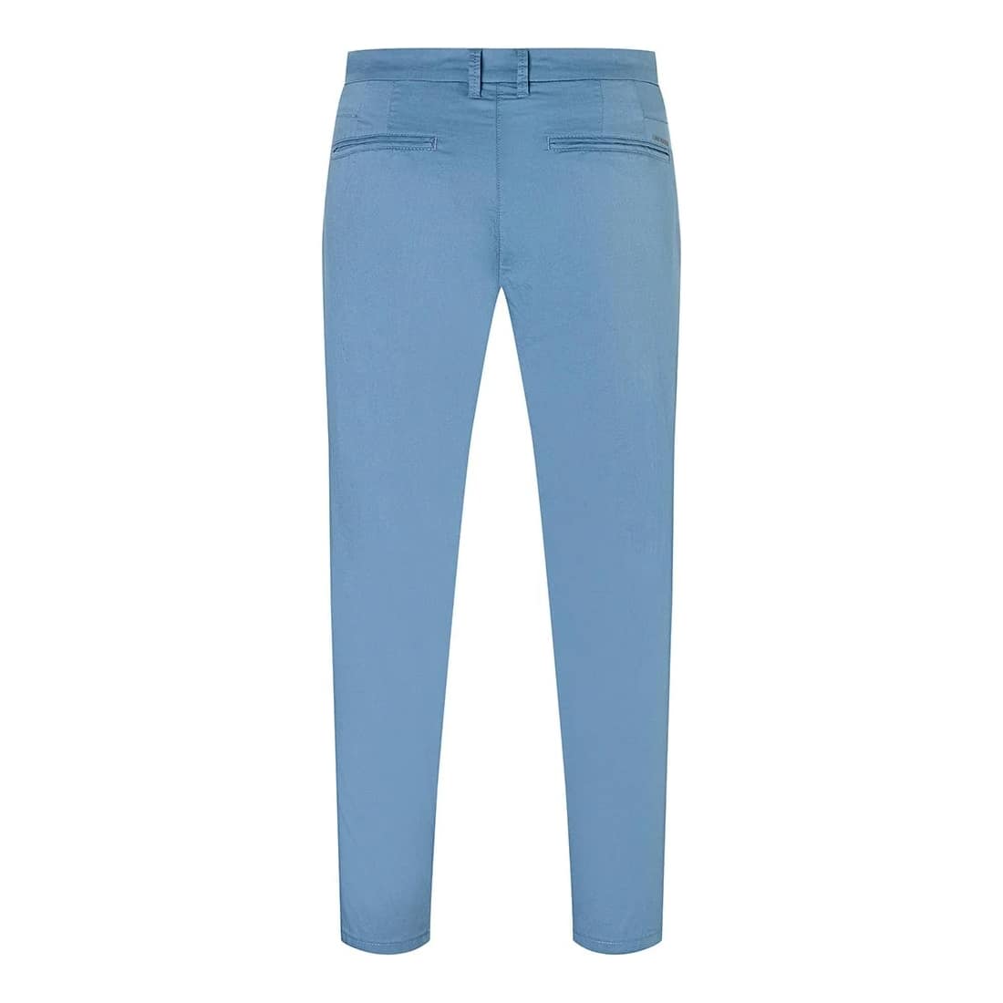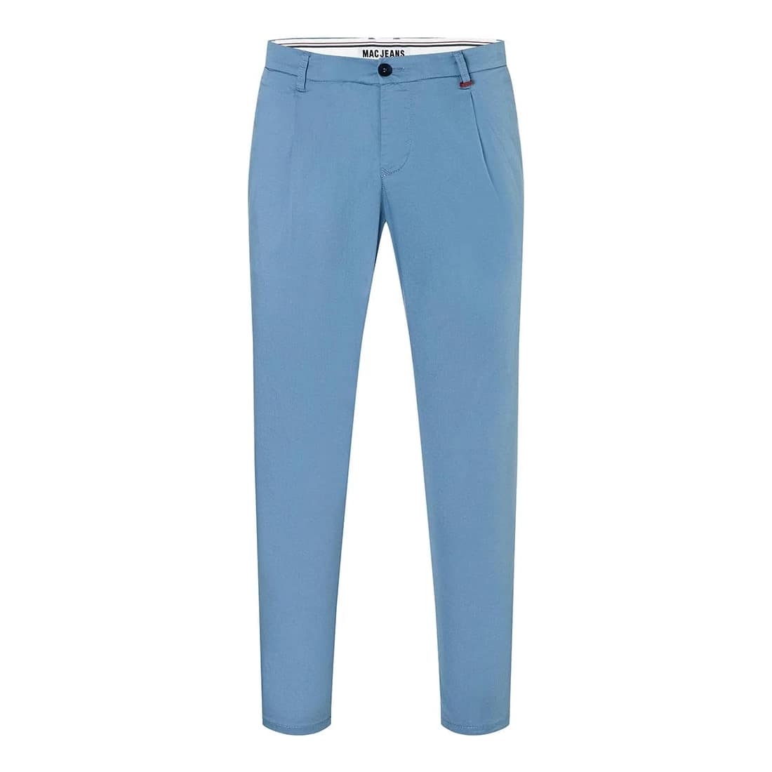 Blauwe pantalon van MAC, model Alex. Deze broek is gemaakt van katoenen stretch stof en heeft een modern fit met een rechte, smalle broekspijp. De pantalon sluit met een knoop- en ritssluiting, heeft twee steekzakken en twee paspelzakken.