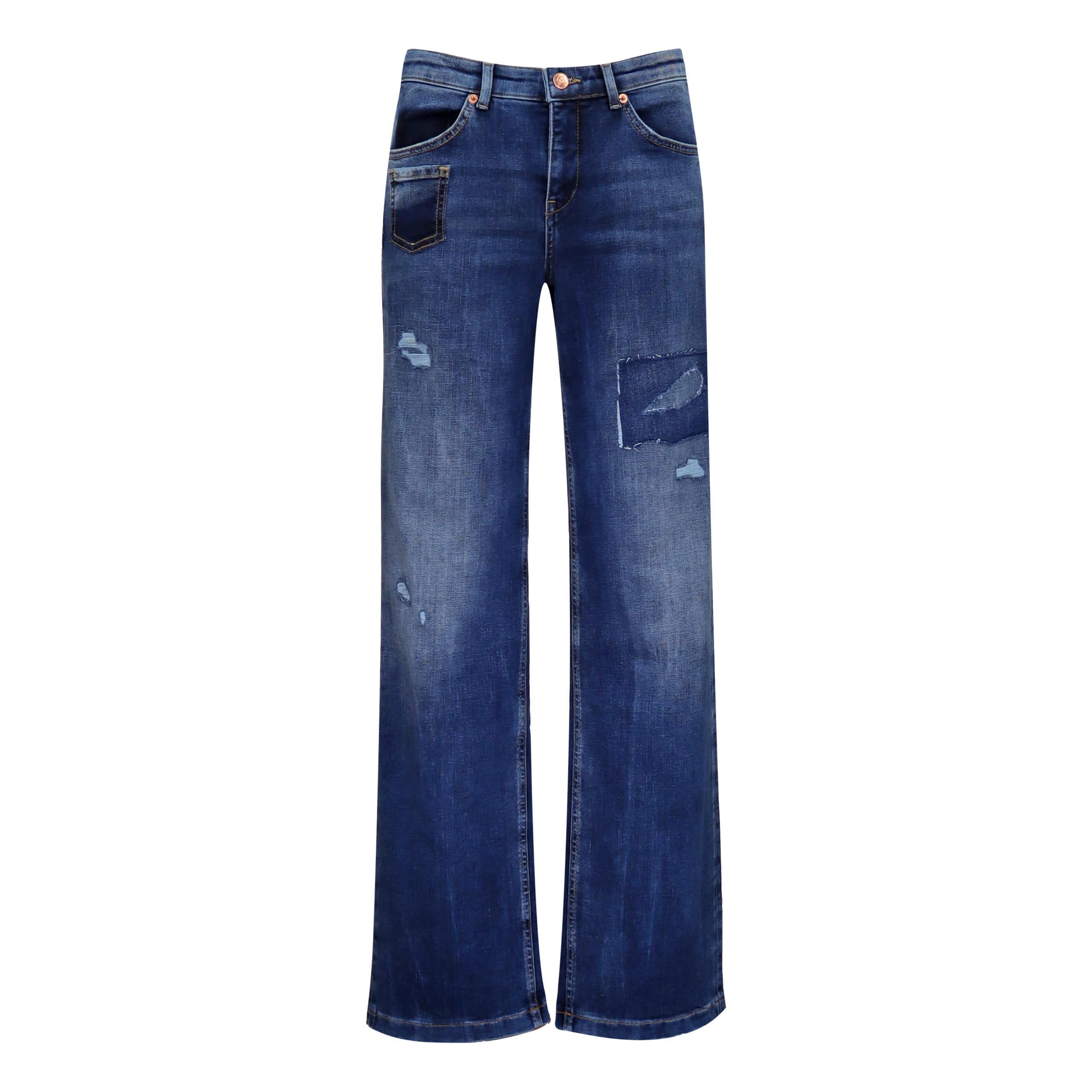 Blauwe jeans van MAC, model Rich Carla pocket, straigth fit, straight leg. Deze denim broek heeft wijde pijpen met beschadigingen en een normale taille. De broek sluit met een knoop- en ritssluiting en heeft twee steekzakken aan de voorzijde en twee achterzakken.