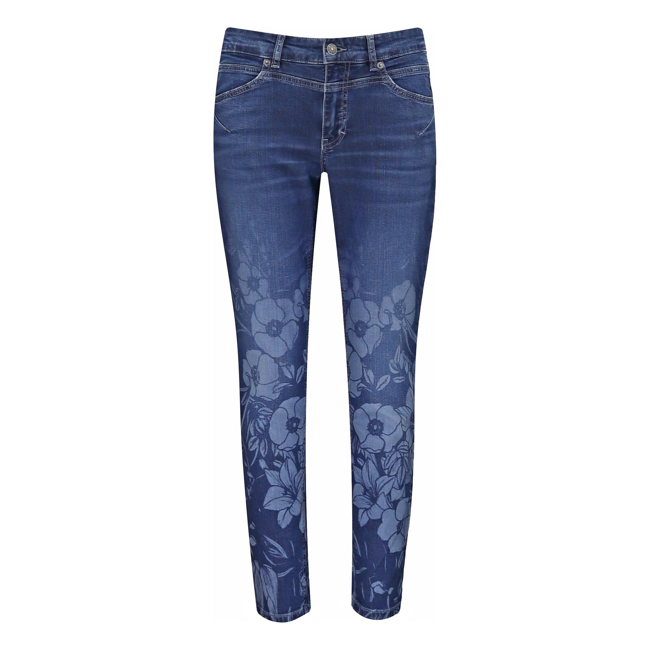 Blauwe jeans van MAC, model Rich Slim 7/8, straight fit, slim leg. Deze 7/8 broek is gemaakt van een ultra light denim stretch stof met een bloemenprint en heeft een slim fit pasvorm. De jeans sluit met een knoop- en ritssluiting, heeft twee steekzakken aan de voorzijde en twee achterzakken.