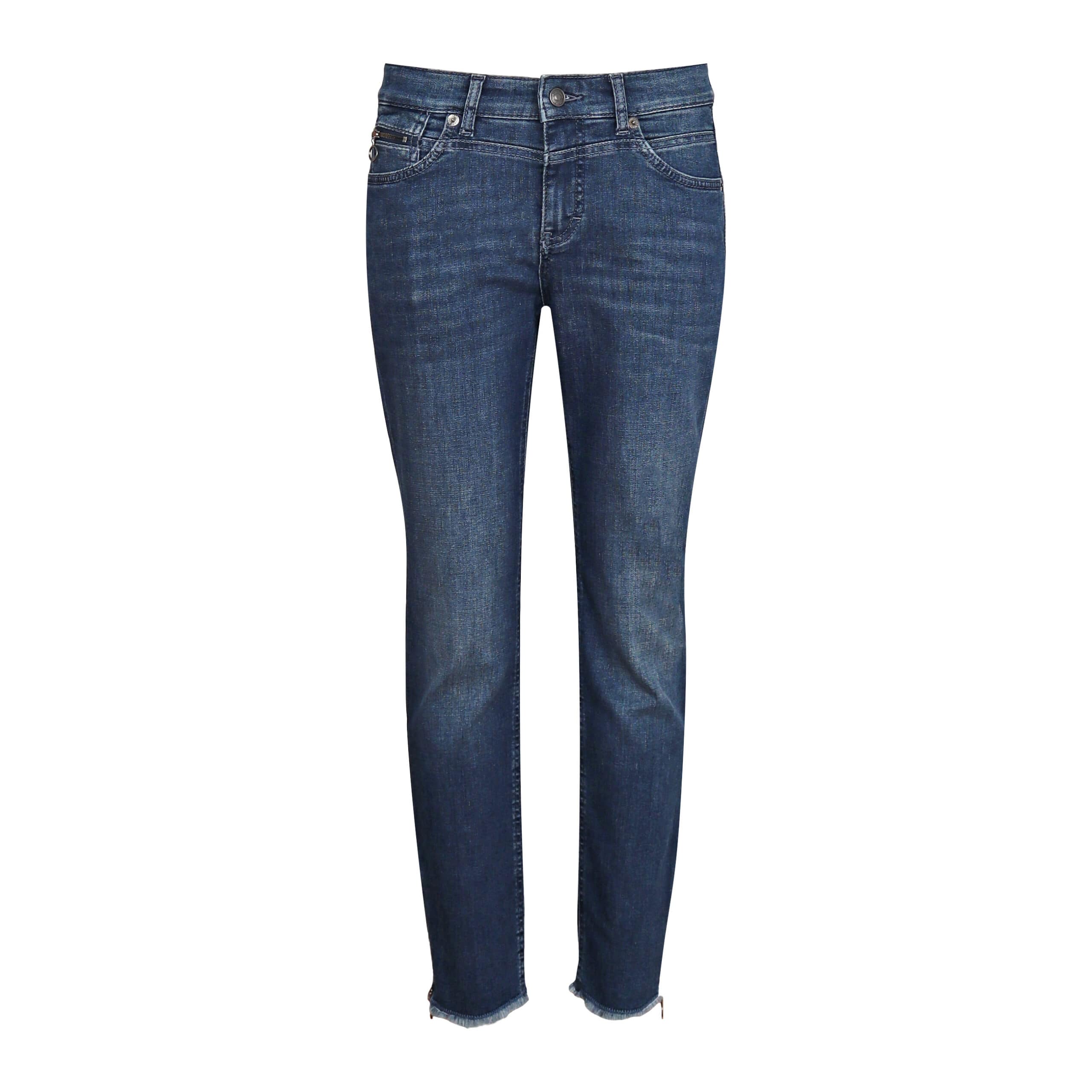 Blauwe jeans van MAC, model Rich Slim chic, straight fit, slim leg. Deze 7/8 jeans heeft een slim fit pasvorm met twee steekzakken en twee achterzakken. De broek is gemaakt van blauwe denim stretch stof en sluit met een knoop- en ritssluiting. De onderzijde van de broekspijpen zijn fijn gerafeld en hebben een ritsje aan de zijkant.