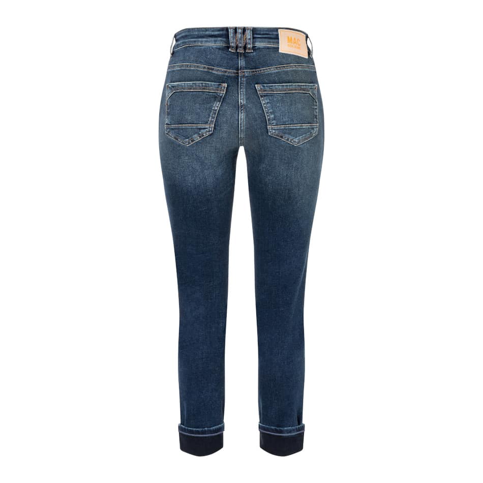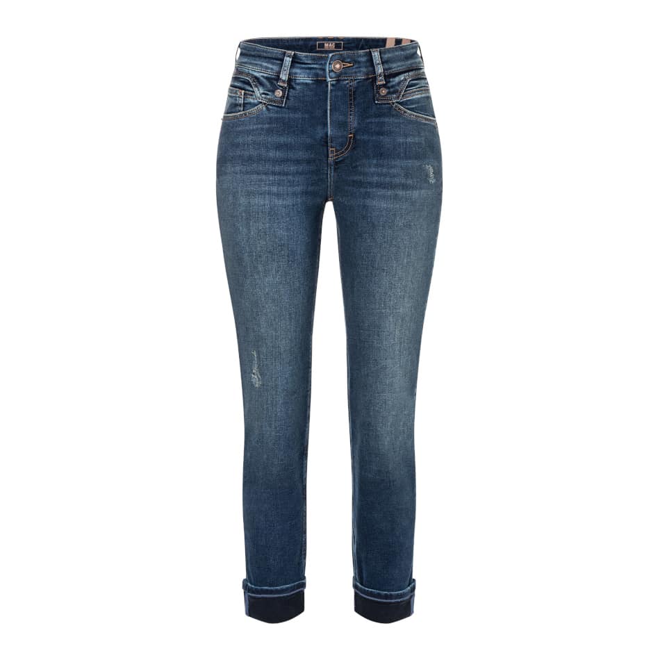 Slim fit jeans van MAC, model Rich Slim, straight fit, slim leg. Deze spijkerbroek is gemaakt van blauwe stretch denim met lichte beschadigingen. De jeans sluit met een knoop- en ritssluiting, heeft een normale taille en heeft twee steekzakken en twee achterzakken.