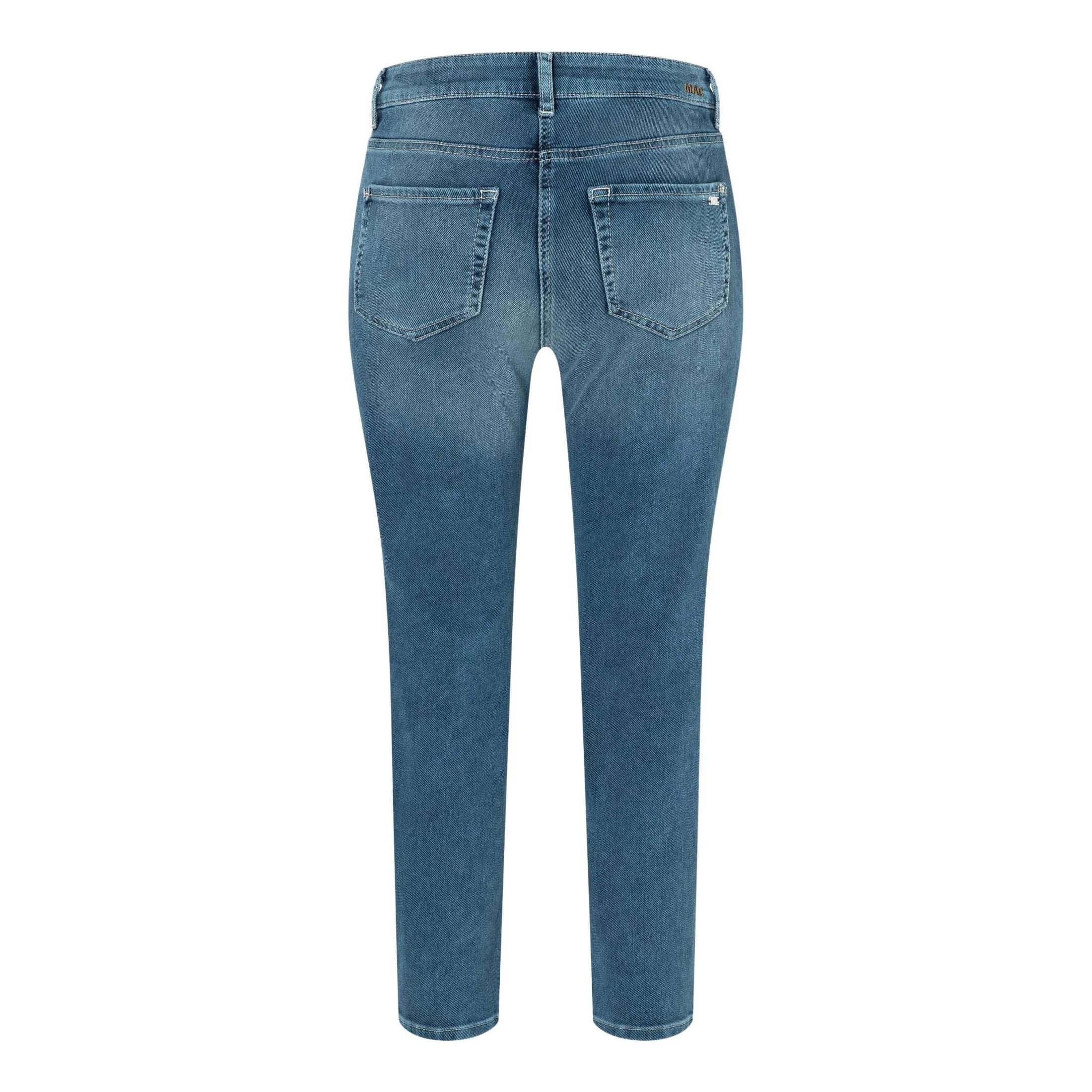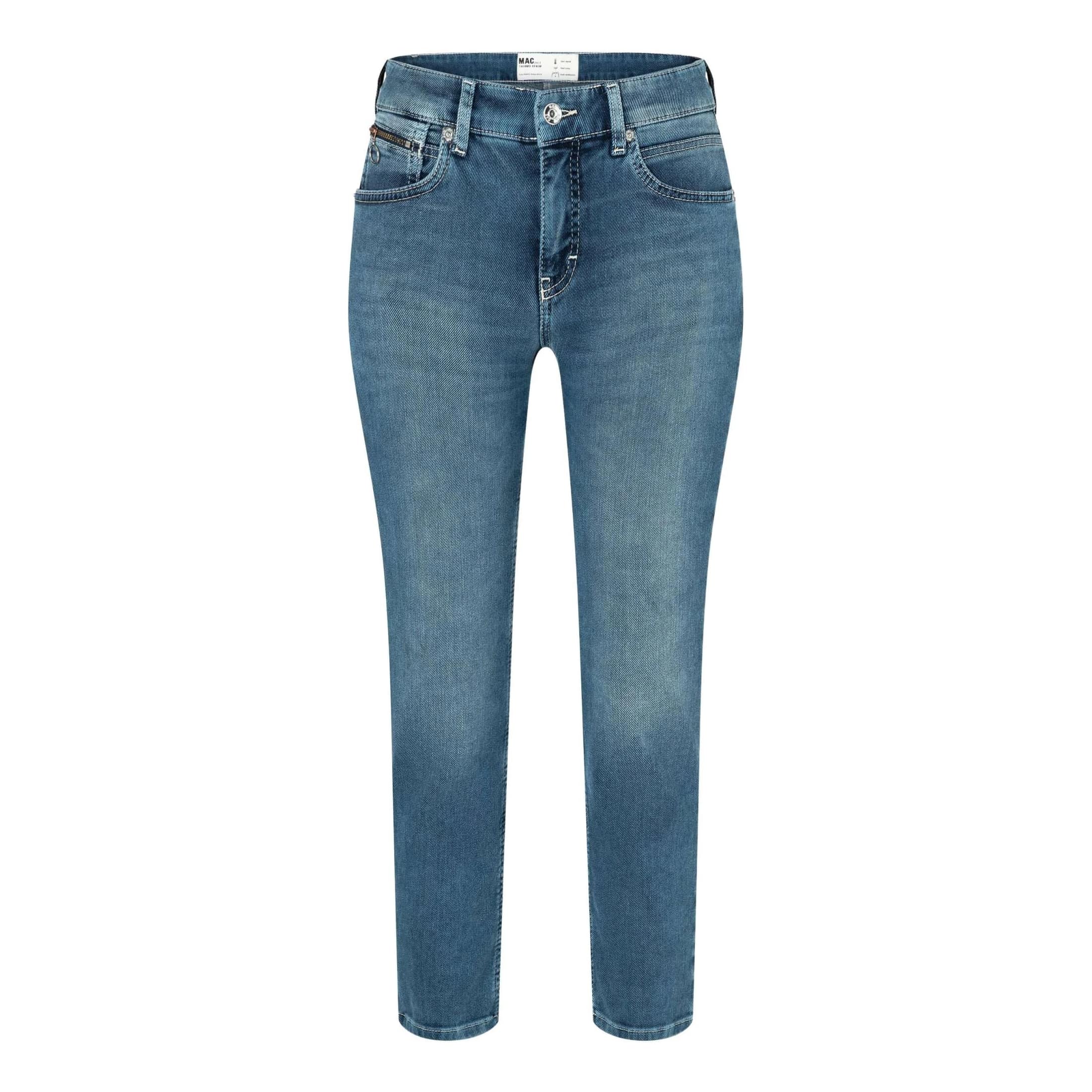 Blauwe jeans van MAC, model Slim, straight fit, slim leg in mid blue authentic. Deze lange broek is gemaakt van stretch thermo denim en heeft een normale taille met rechte broekspijpen. De slim fit jeans sluit met een knoop- en ritssluiting en heeft twee steekzakken en twee achterzakken.