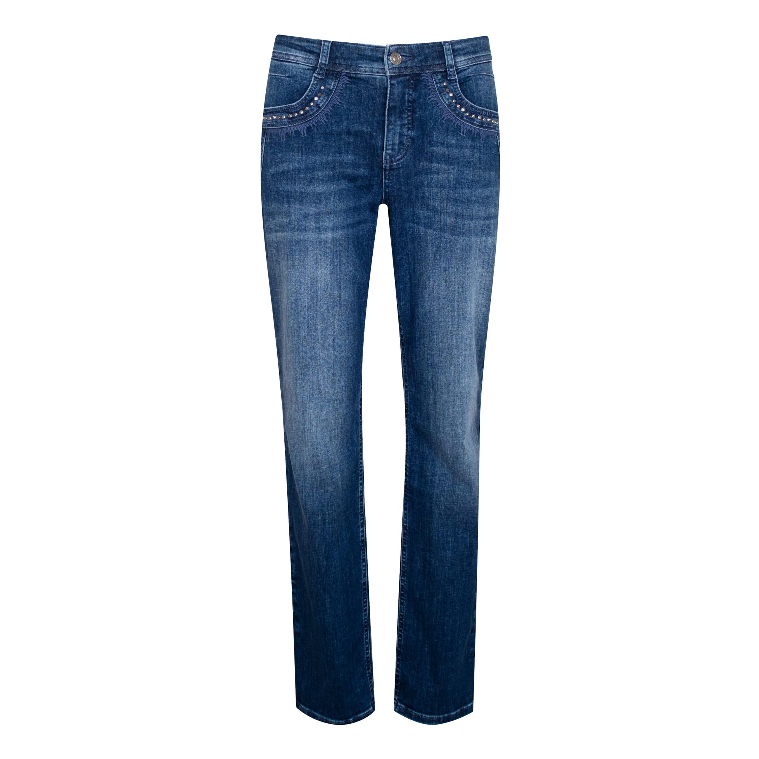 Blauwe jeans van MAC, model Sue fashion, straight fit, straight leg. Deze denim broek heeft twee steekzakken die bezet zijn met zilveren studs en blauw borduursel, twee achterzakken en sluit met een knoop- en ritssluiting. De jeans is gemaakt van blauwe denim stretch stof en heeft een rechte pasvorm.