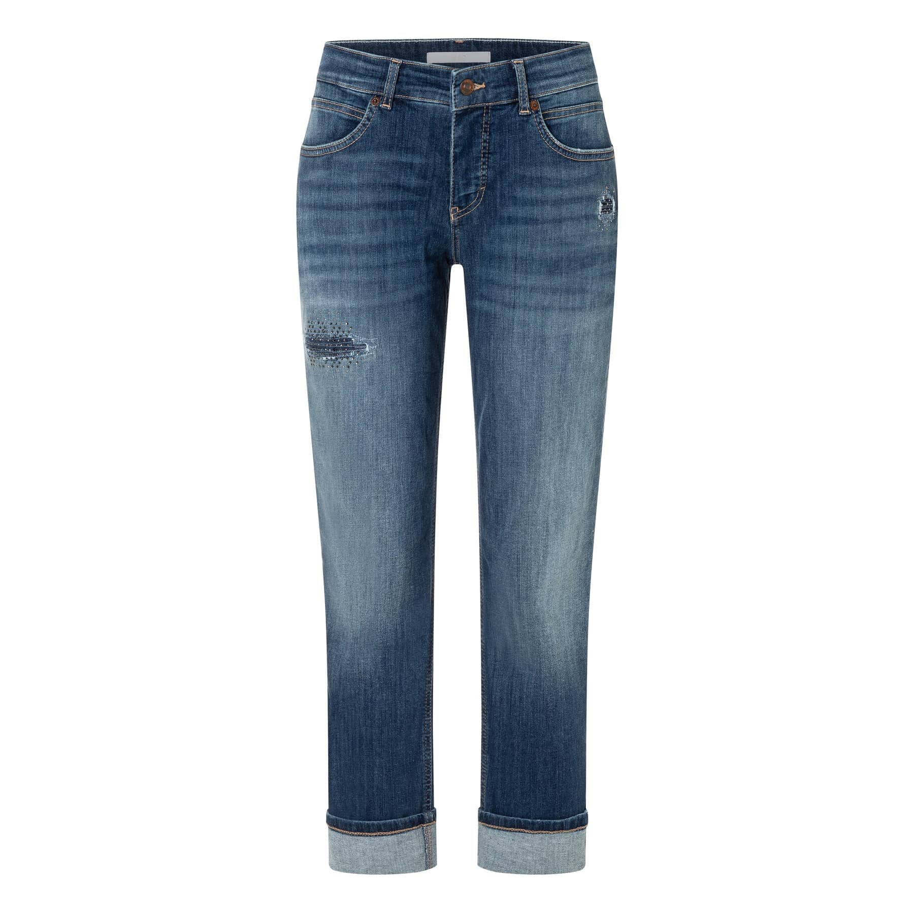 Blauwe jeans van MAC, model Sue glam, straight fit, straight leg in fancy repaired blue. Deze denim broek heeft twee steekzakken aan de voorzijde, twee achterzakken en sluit met een knoop- en ritssluiting. De jeans is gemaakt van blauwe denim stretch stof met decoratieve beschadigingen met steentjes en en heeft een rechte pasvorm.