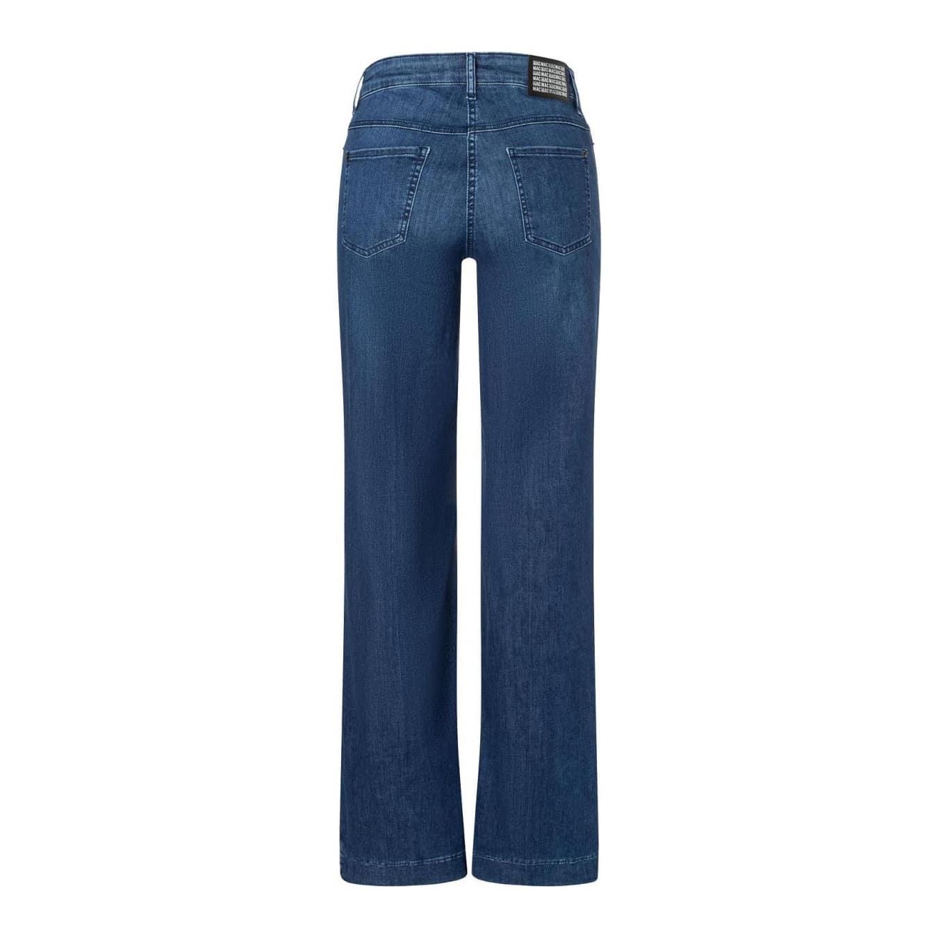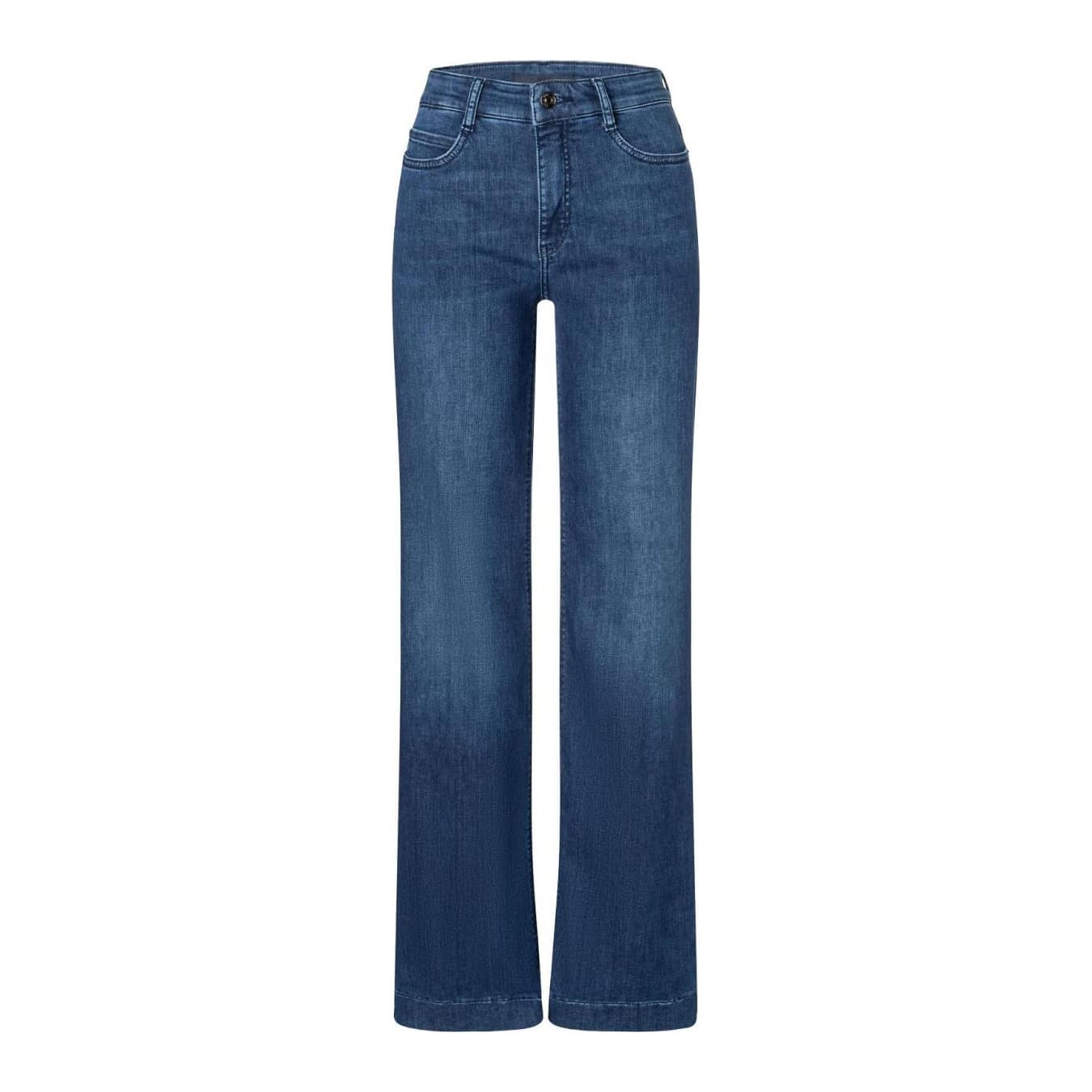 Blauwe jeans van MAC, model Wide, straight fit, wide leg in navy blue washed. Deze broek is gemaakt van stretch denim, heeft een hogere taille en wijde, rechte broekspijpen. De jeans sluit met een knoop- en ritssluiting, heeft twee steekzakken en twee achterzakken.