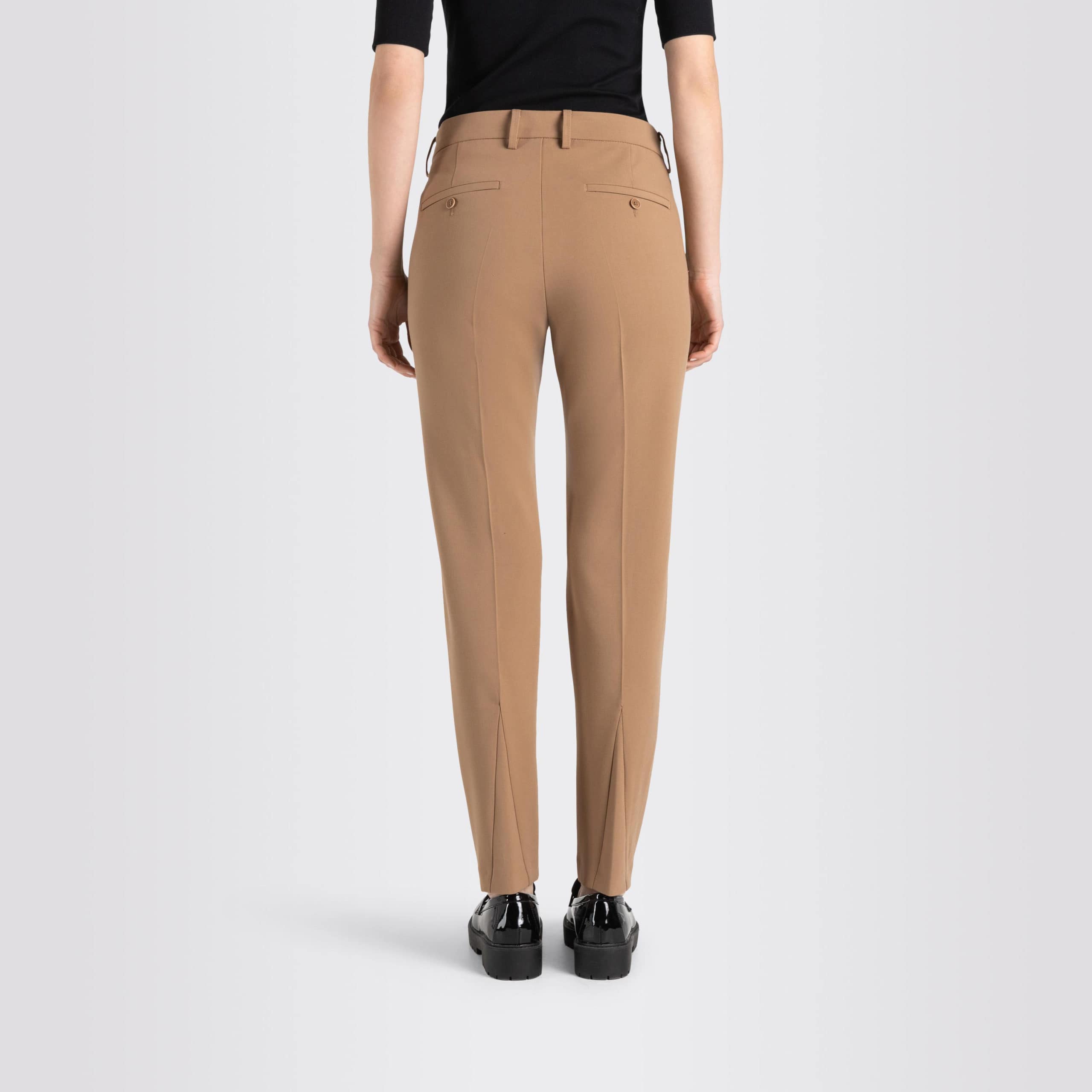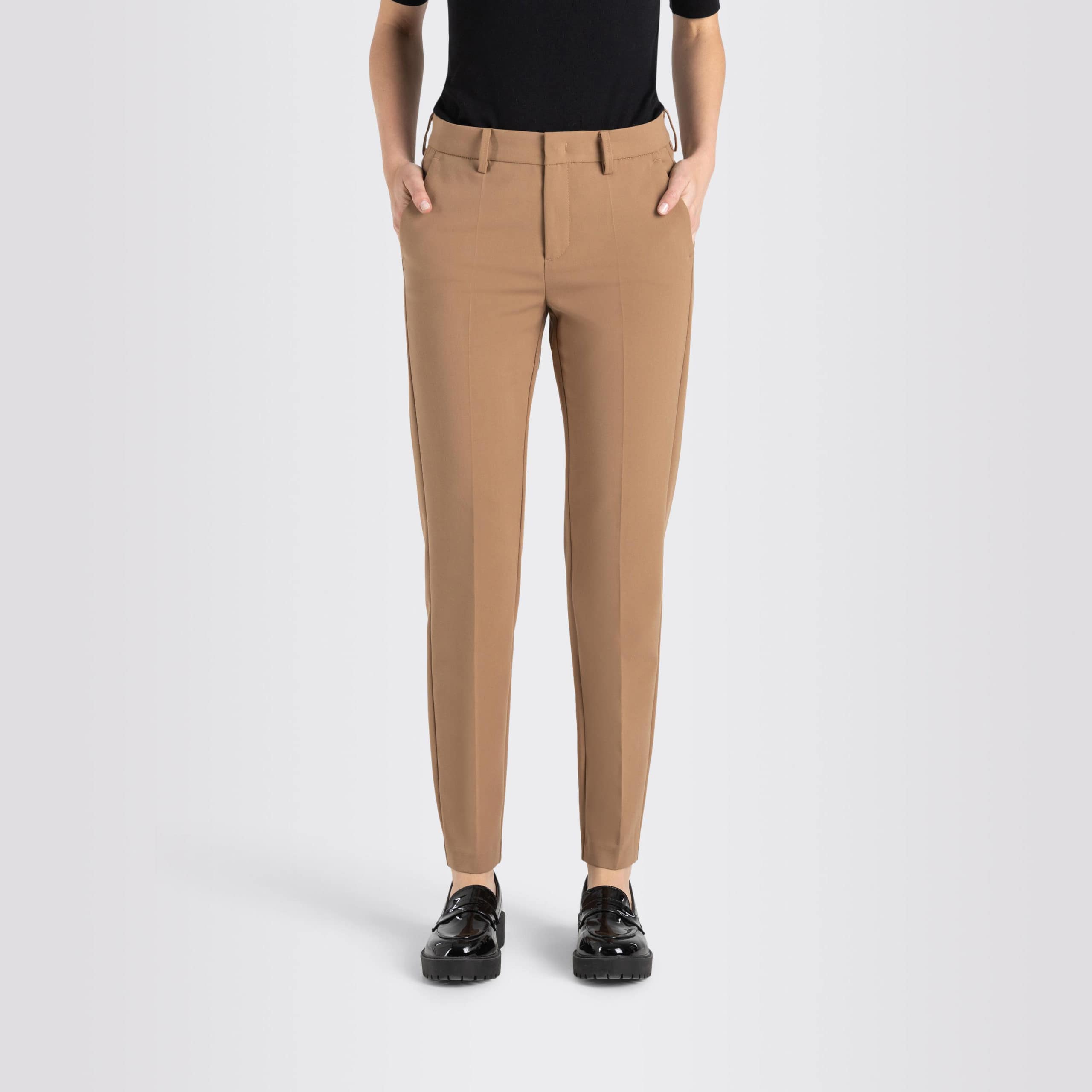 Jersey pantalon van MAC, model Chia in toffee brown. Deze bruine pantalon is gemaakt van zachte stretch stof en heeft toelopende broekspijpen. De broek sluit met een haakje, knoop- en ritssluiting, heeft twee steekzakken en twee sier paspelzakken.