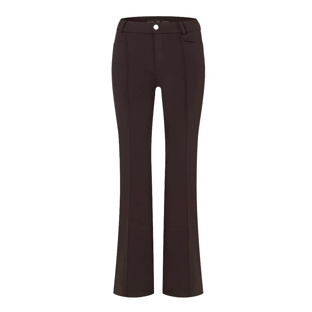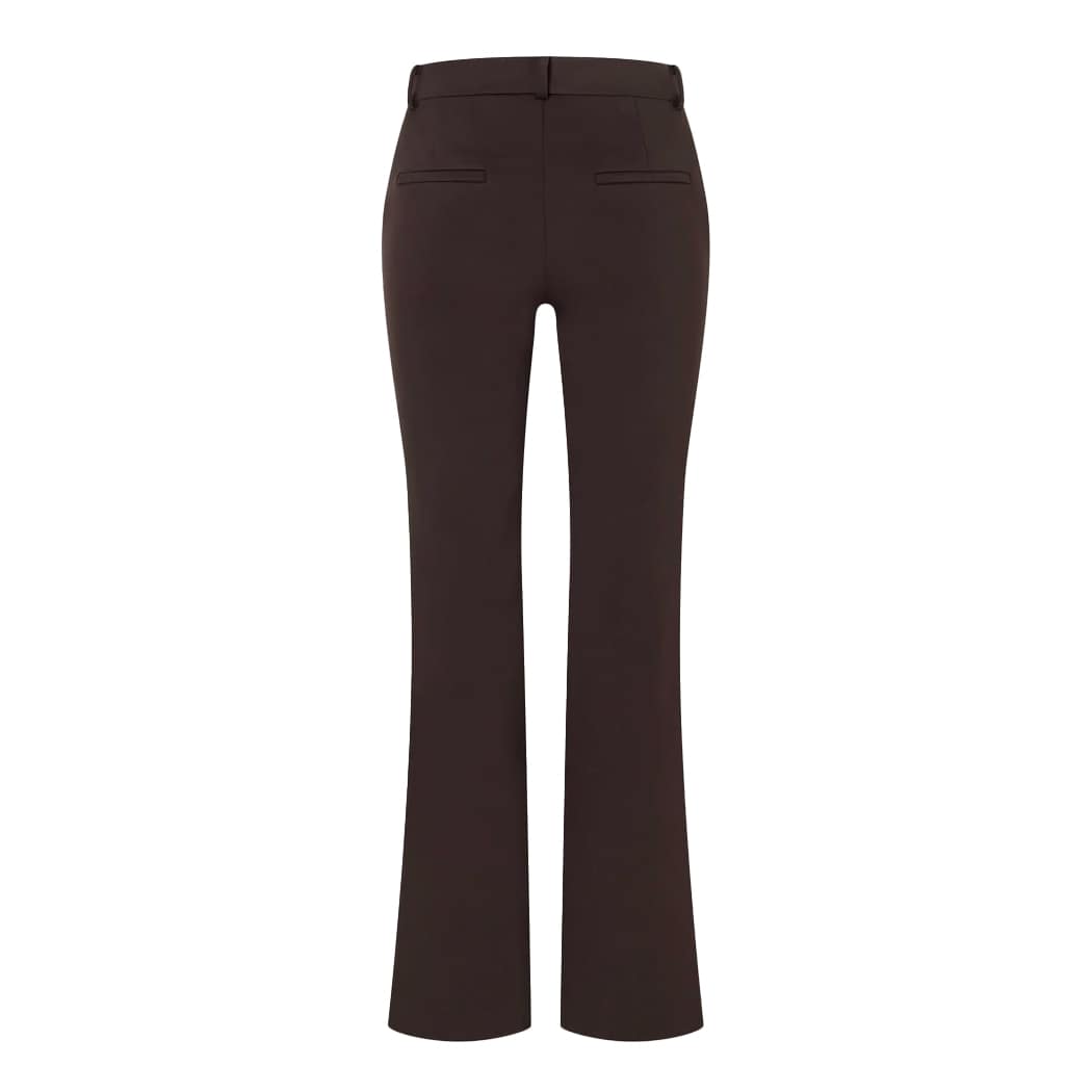 Donkerbruine pantalon van MAC, model Dream Boot luxury in espresso. Deze broek is gemaakt van een gladde bruine stretch stof. De pantalon heeft lange, rechte broekspijpen met een vaste naad, aan de onderzijde een bootcut, sluit met een knoop- en ritssluiting, heeft twee steekzakken en twee sier paspelzakken.