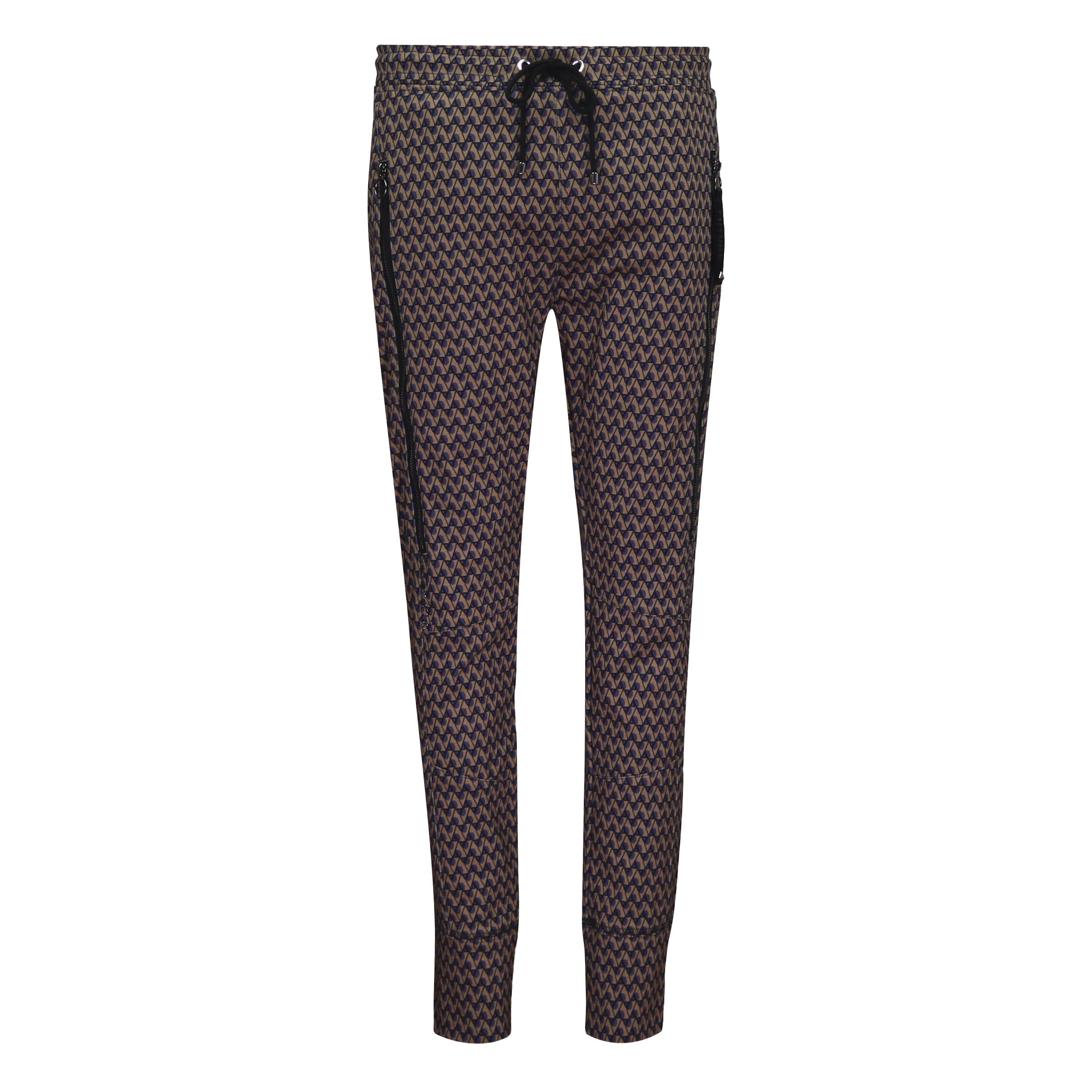 Relaxte pantalon van MAC, model Future 2.0 sparkle. Deze broek is gemaakt van een soepel vallende jersey stretch stof met een bruin paars motief. De broek heeft een elastische tailleband met trekkoord, taps toelopende broekspijpen met twee zakken achter ritsjes aan de voorzijde en een relaxed slim fit pasvorm. Onder de zakken met ritsen heeft deze broek een versiering met steentjes.