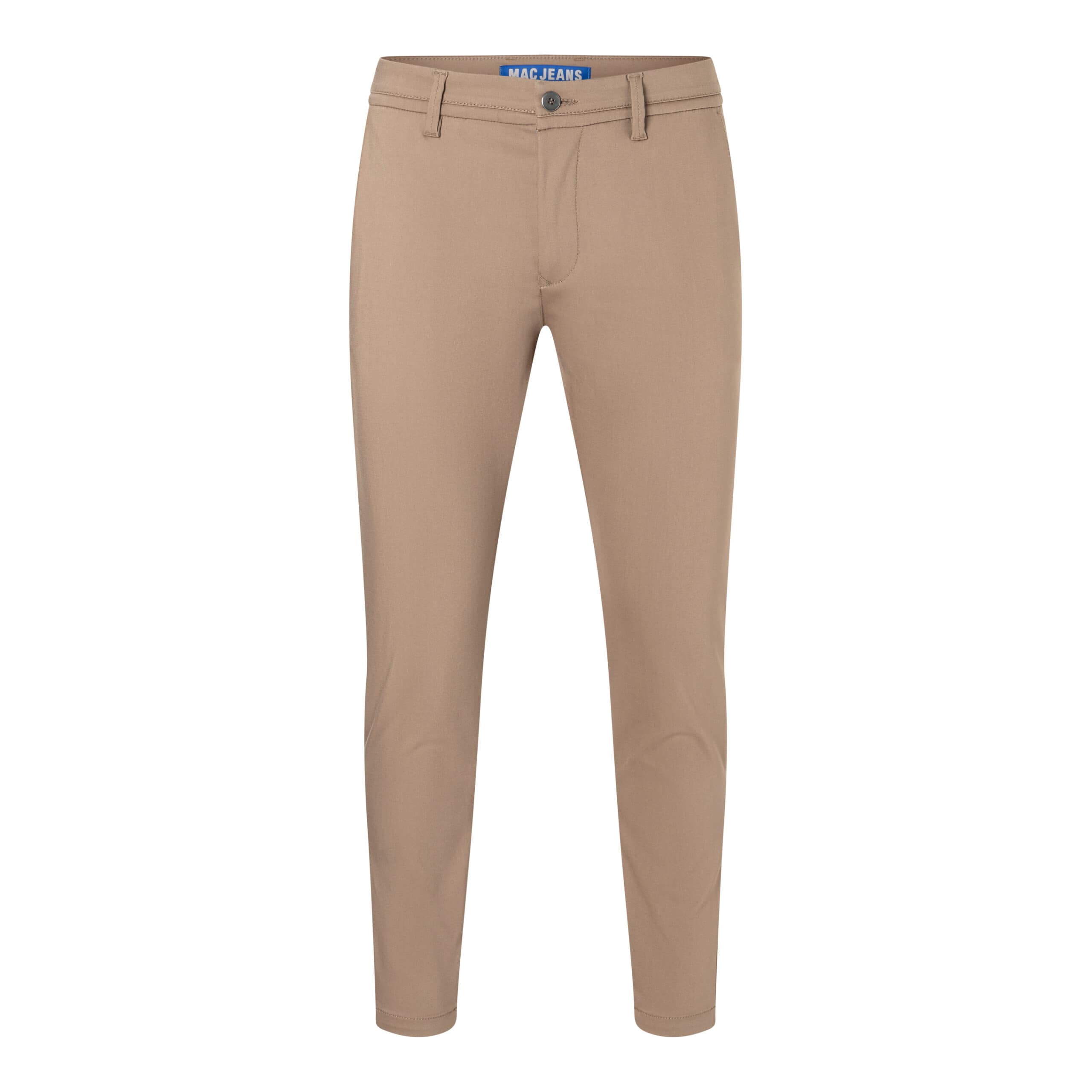 Bruine pantalon van MAC, model Griffin, tapered fit in clay. Deze chino is gemaakt van stretch stof, heeft een tapered fit met toelopende, smallere broekspijpen. De pantalon sluit met een knoop- en ritssluiting, heeft twee steekzakken, twee sier paspelzakken en een normale taille.