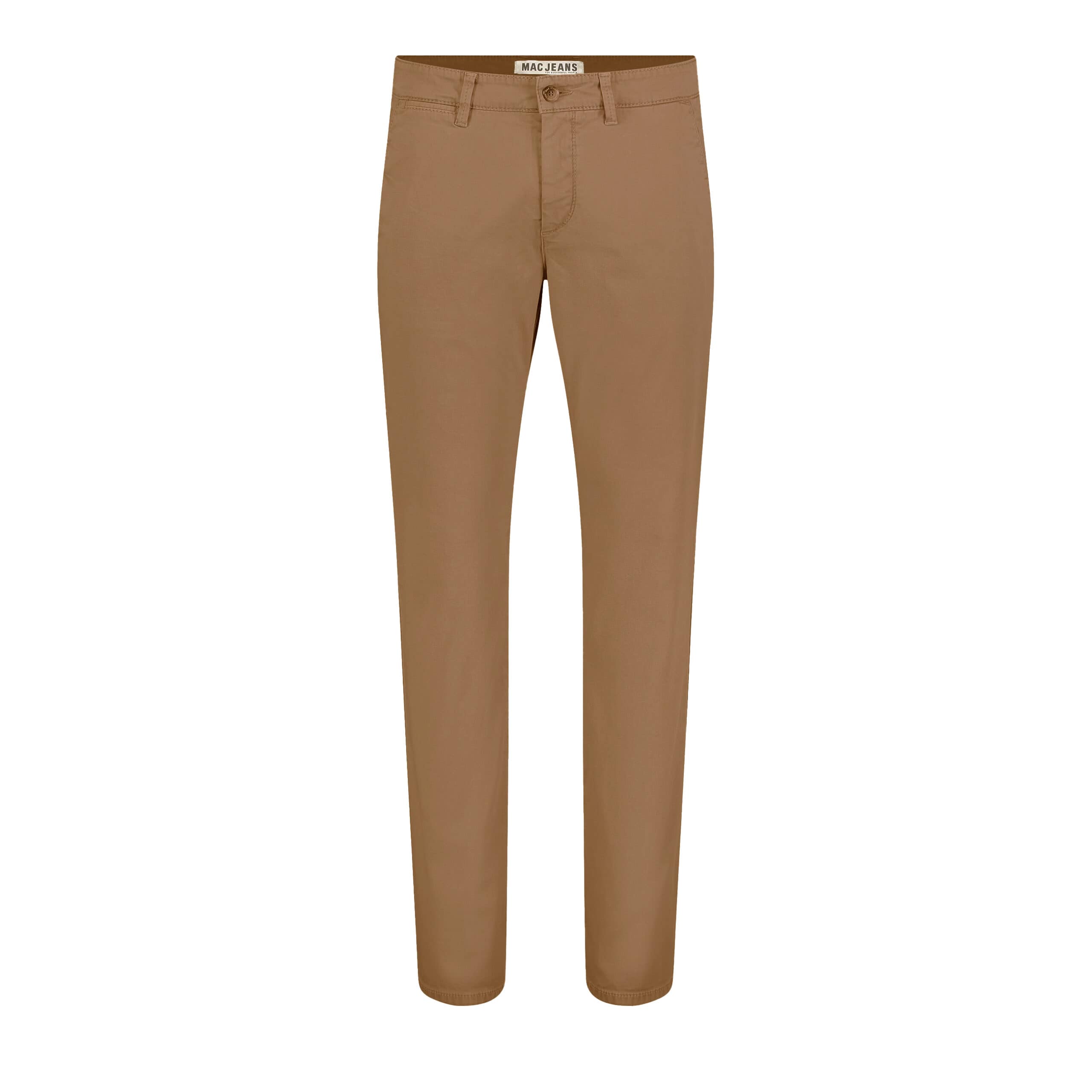 Bruine pantalon van MAC, model Lennox. Deze broek is gemaakt van katoenen stretch stof en heeft een modern fit met een rechte, smalle broekspijp. De pantalon sluit met een knoop- en ritssluiting, heeft twee steekzakken en twee achterzakken.