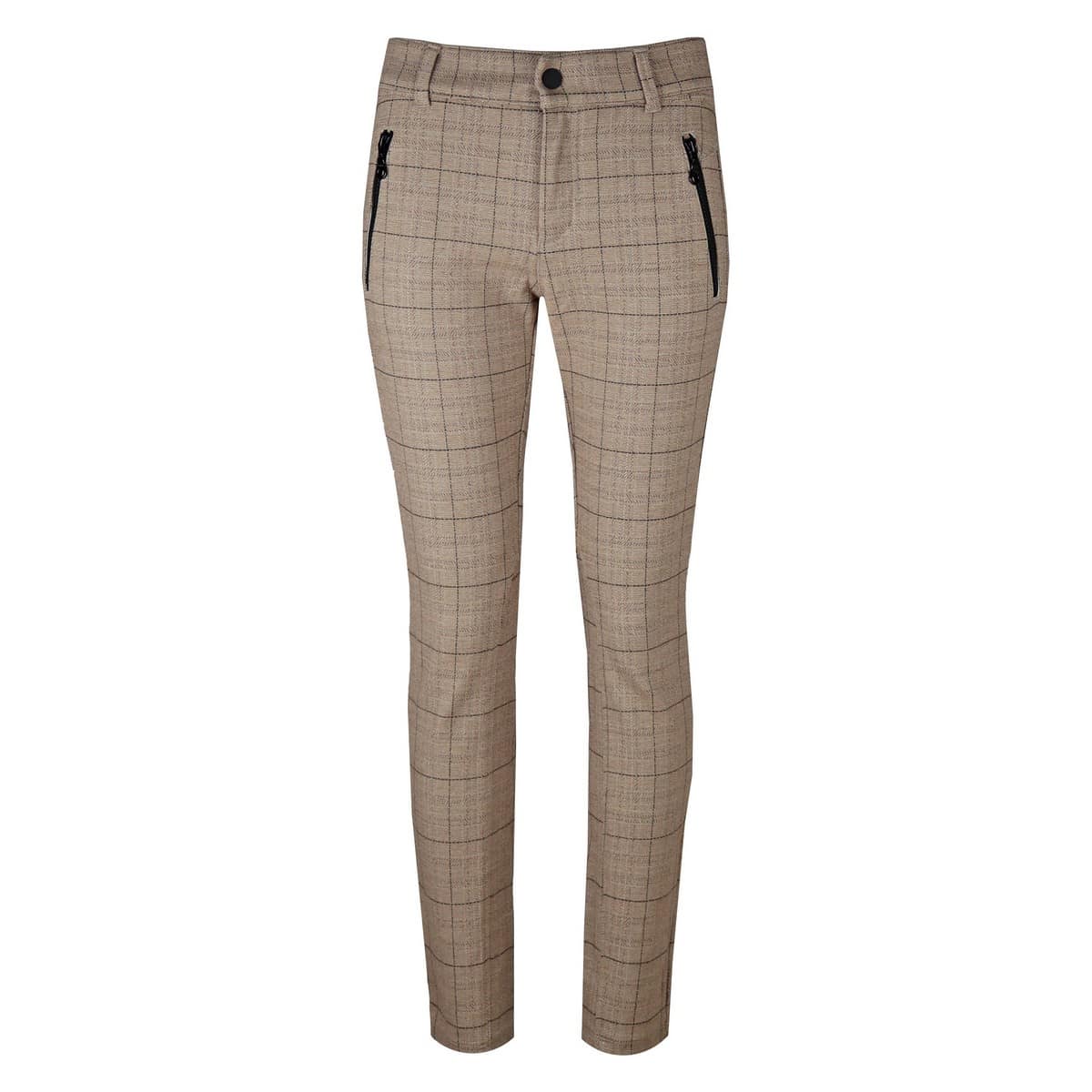 Relaxte pantalon van MAC Jeans, model Vision Riding. Deze broek heeft twee steekzakken achter ritsjes aan de voorzijde en twee sier paspelzakken aan de achterzijde. De broek is gemaakt van een soepelvallende bruin geruite stretch stof en sluit met een drukknop, knoop- en ritssluiting.