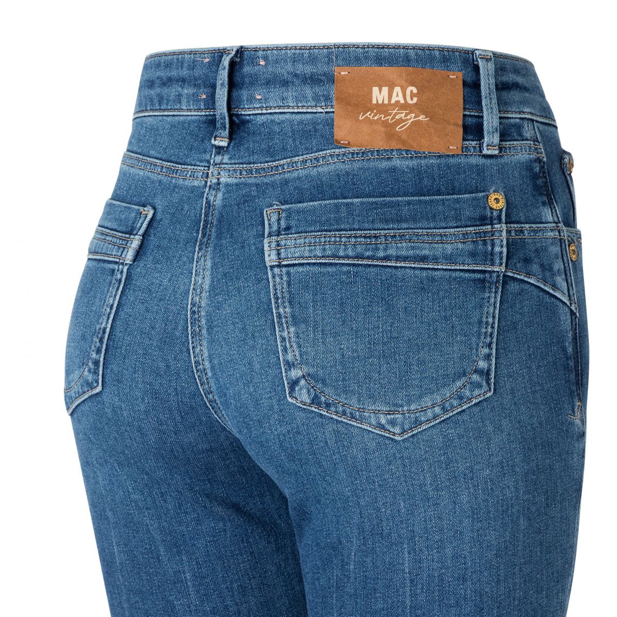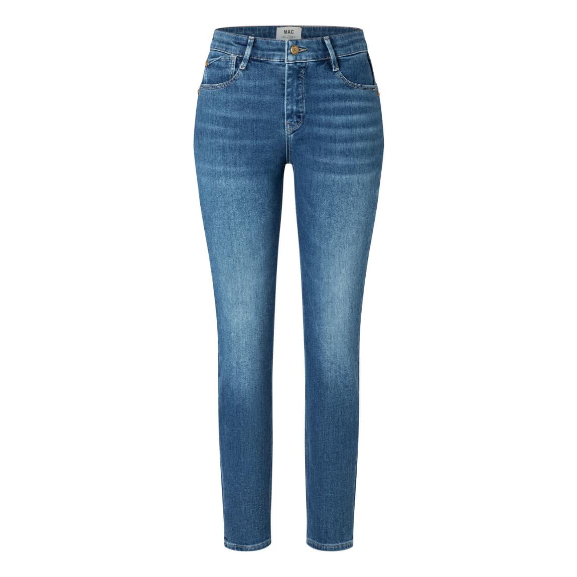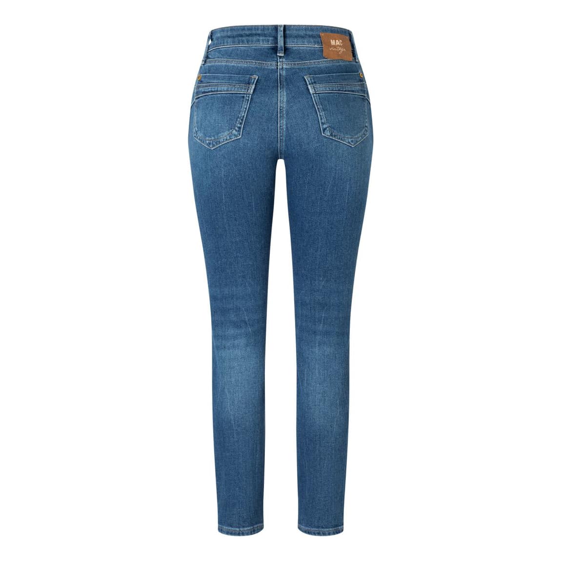 Blauwe jeans van MAC, model California Slim, slim fit, low rise, 5-pocket in mid blue netwash. Deze broek is gemaakt van stretch denim, heeft een normale taille en een slim fit pasvorm. De broek sluit met een knoop- en ritssluiting, heeft twee steekzakken en twee achterzakken.