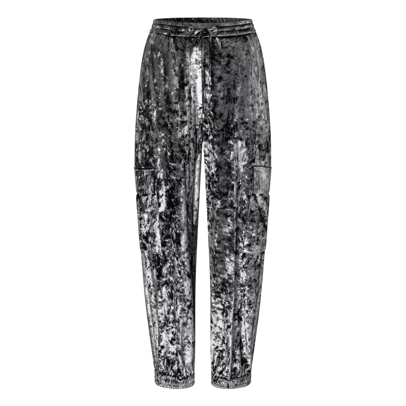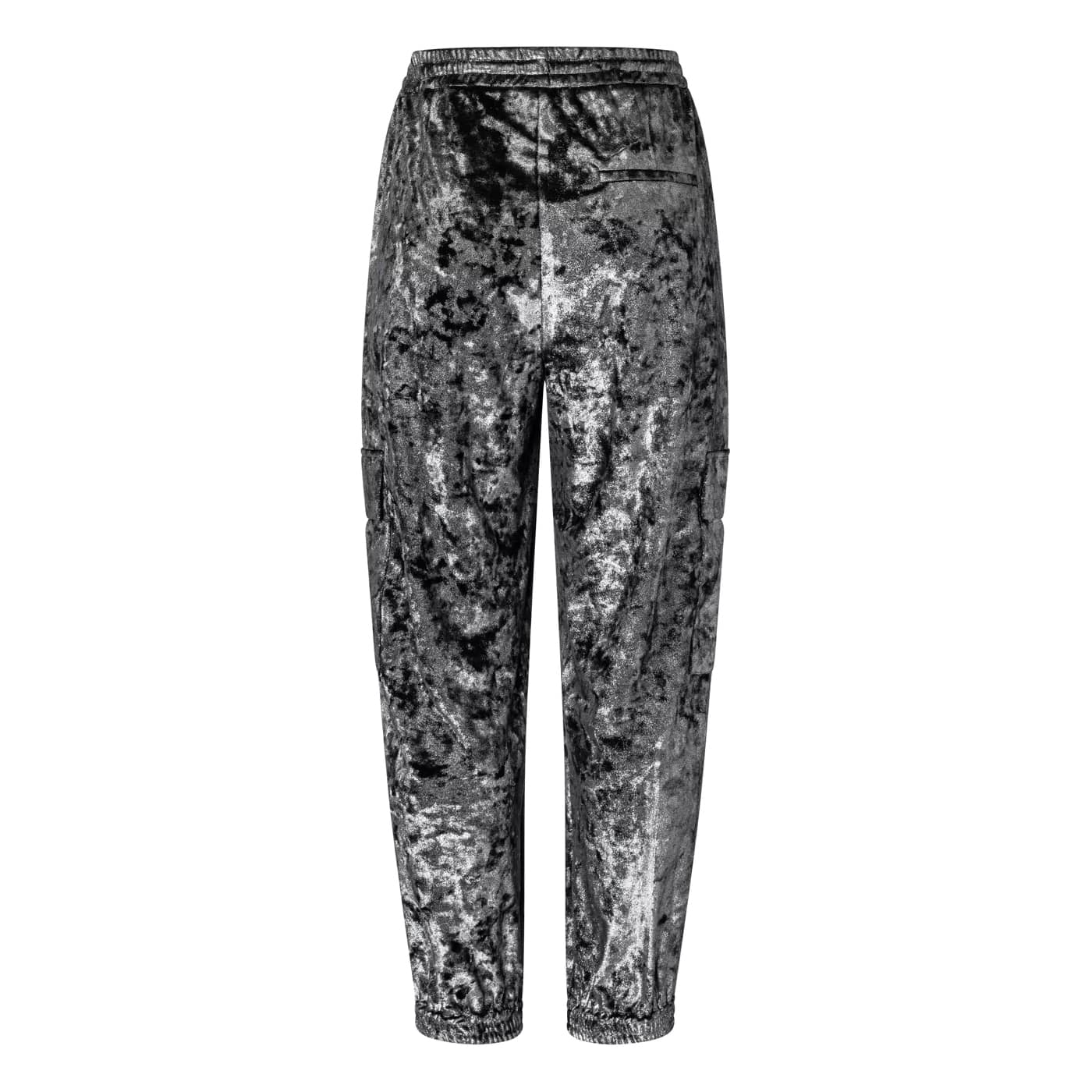 Relaxte broek van MAC, model Cargo velvet. Deze broek is gemaakt van een zwarte, zilveren fluwelen stof, heeft een hogere taille, relaxed fit met toelopende broekspijpen. De broek heeft een elastische taille met een trekkoord, twee steekzakken en twee cargo zakken.