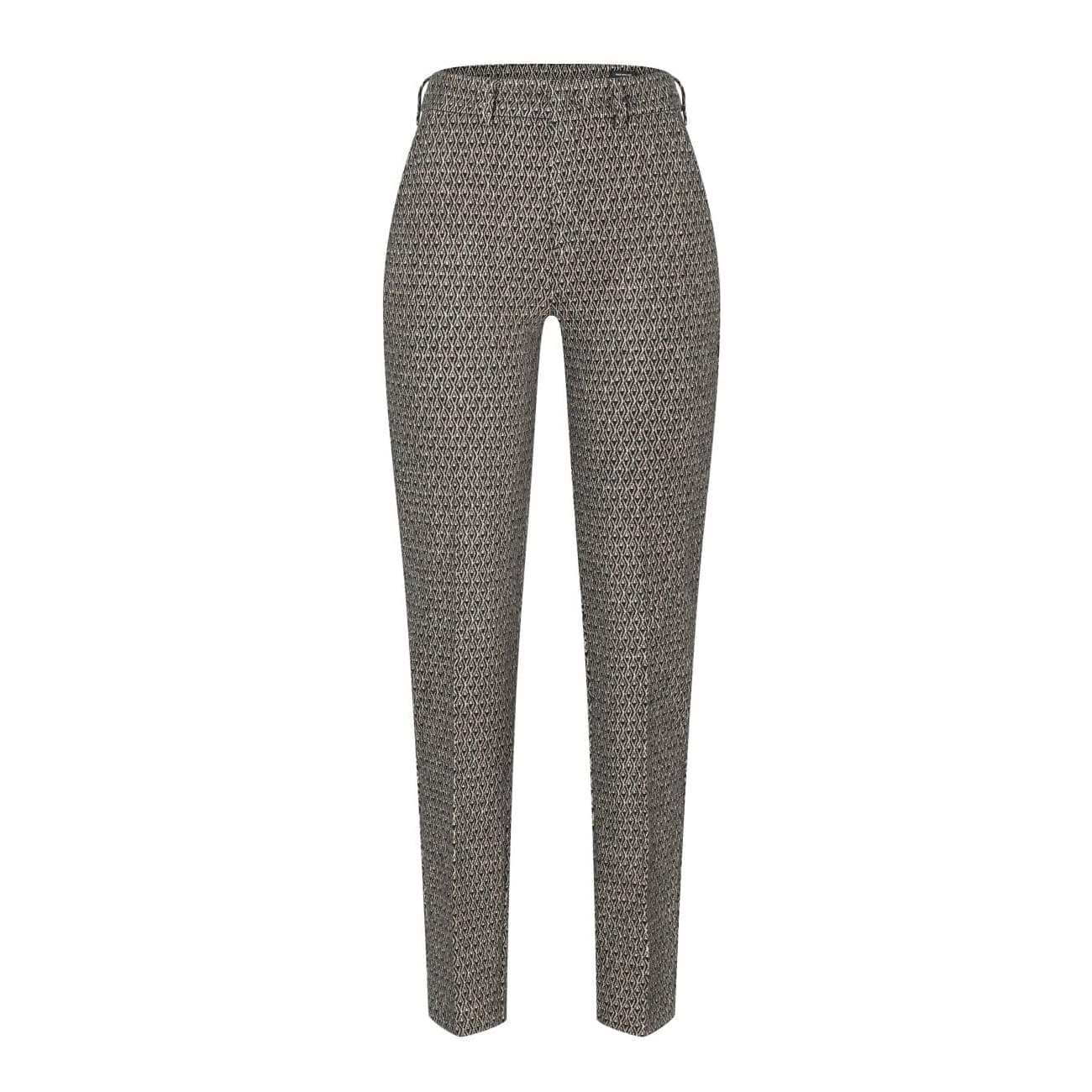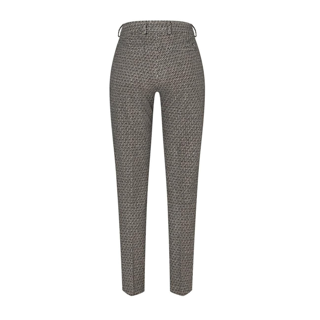 Jersey pantalon van MAC, model Chia in zandbeige jacquard. Deze pantalon is gemaakt van zachte stretch stof met beige, zwart motief en heeft toelopende broekspijpen. De broek sluit met een haakje, knoop- en ritssluiting, heeft twee steekzakken en twee sier paspelzakken.