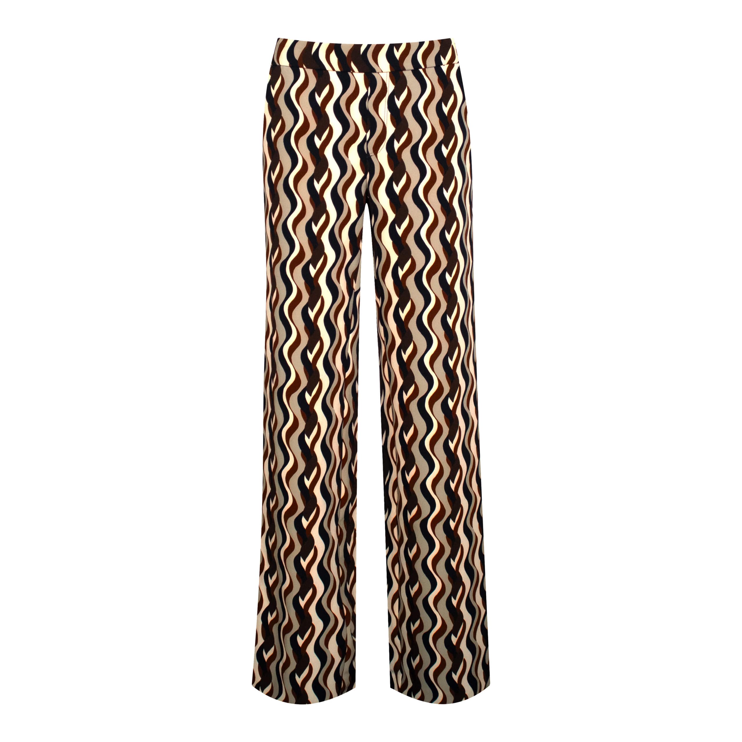 Bruine pantalon met motief van MAC, model Chiara. Deze pantalon is gemaakt van een gladde stretch stof met een effen bruin zwart golvend motief en heeft rechte, wijde broekspijpen. De losvallende broek heeft een elastische taille, twee steekzakken en een sier paspelzakje.