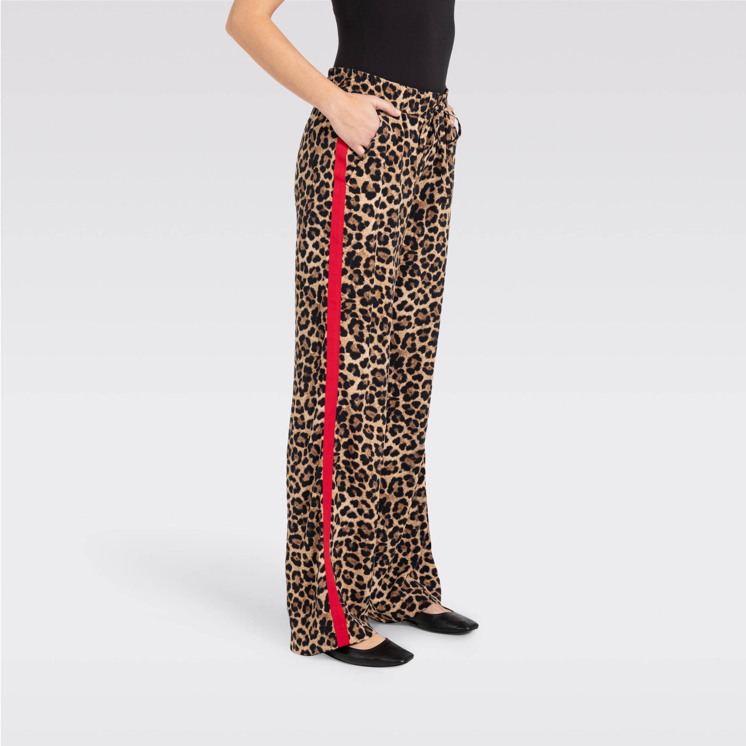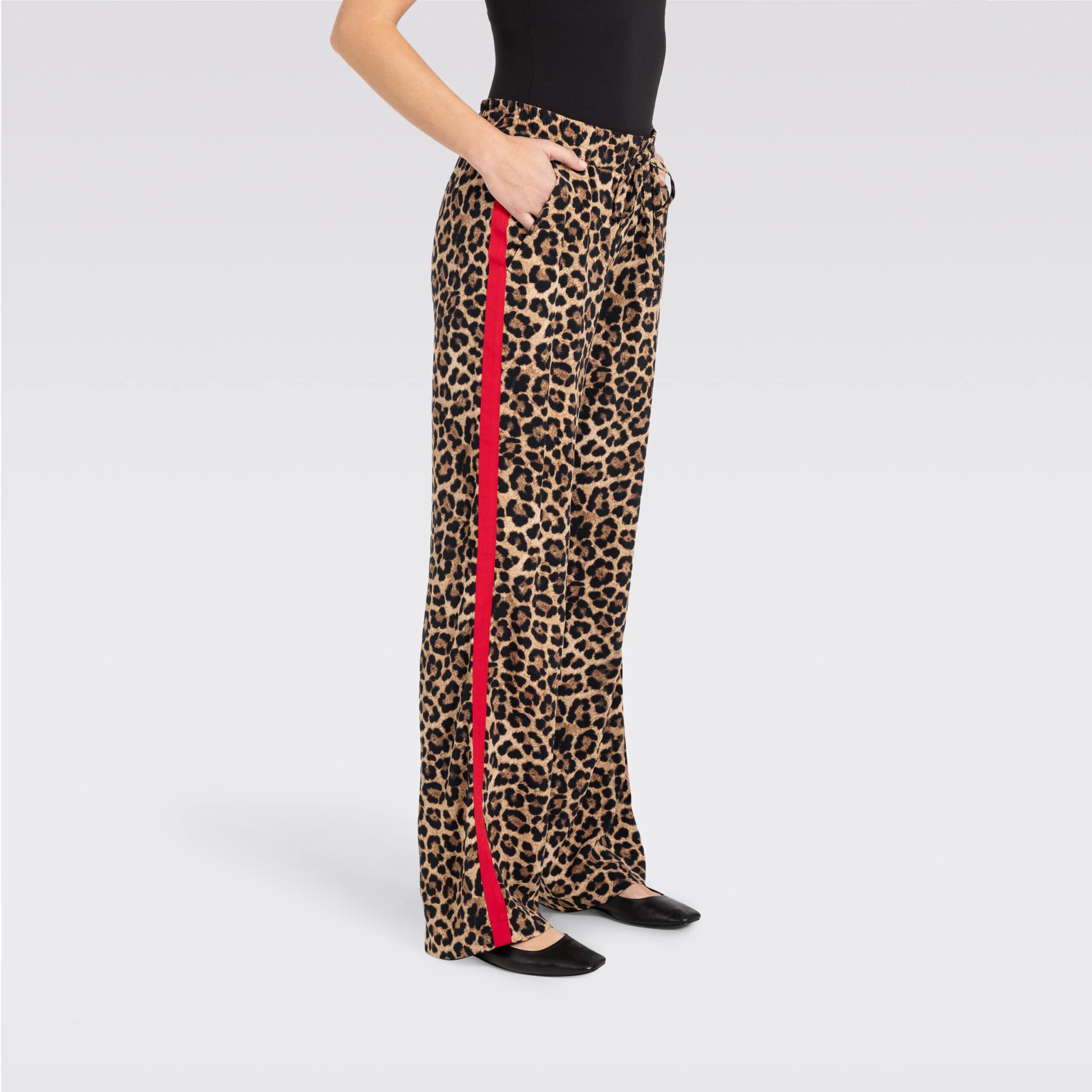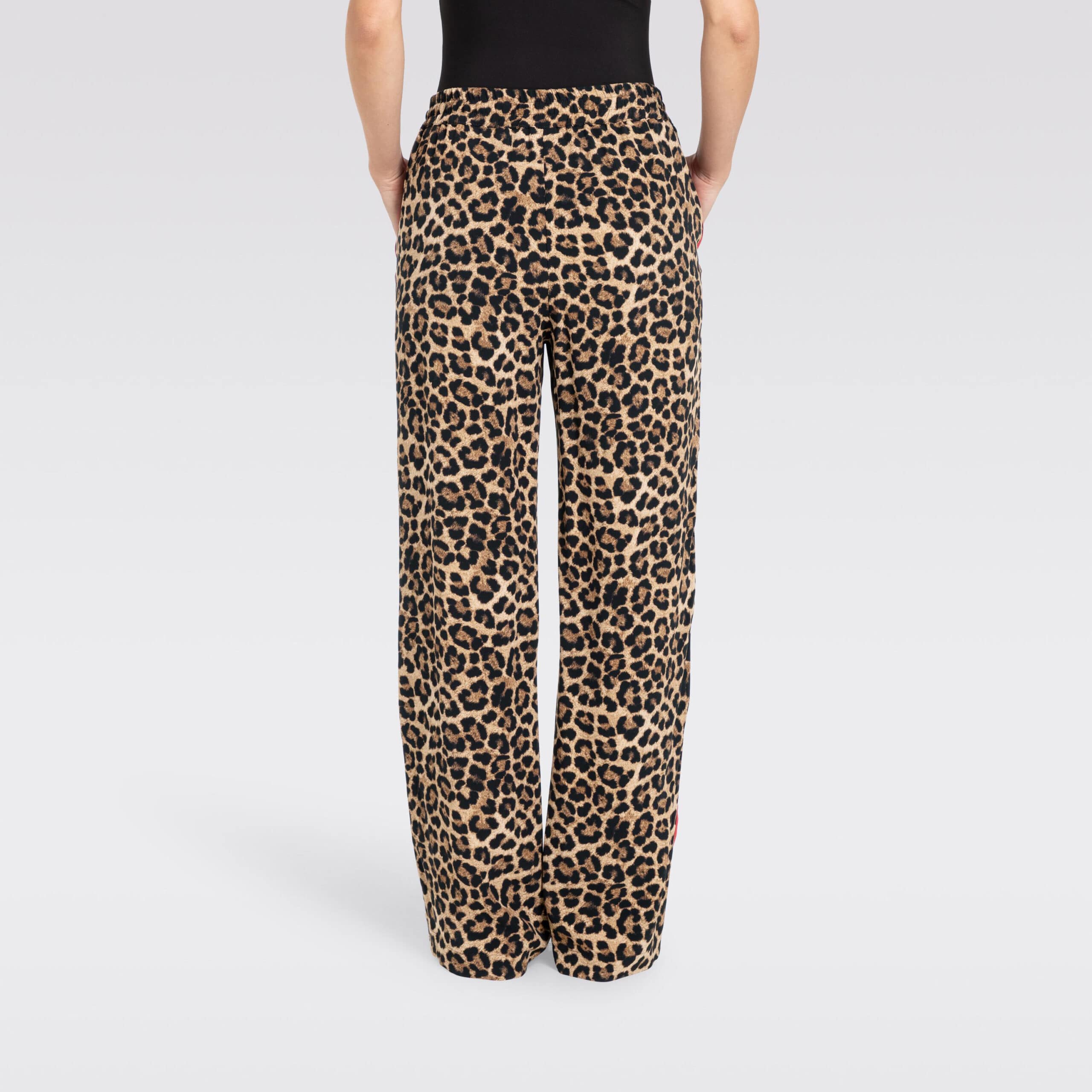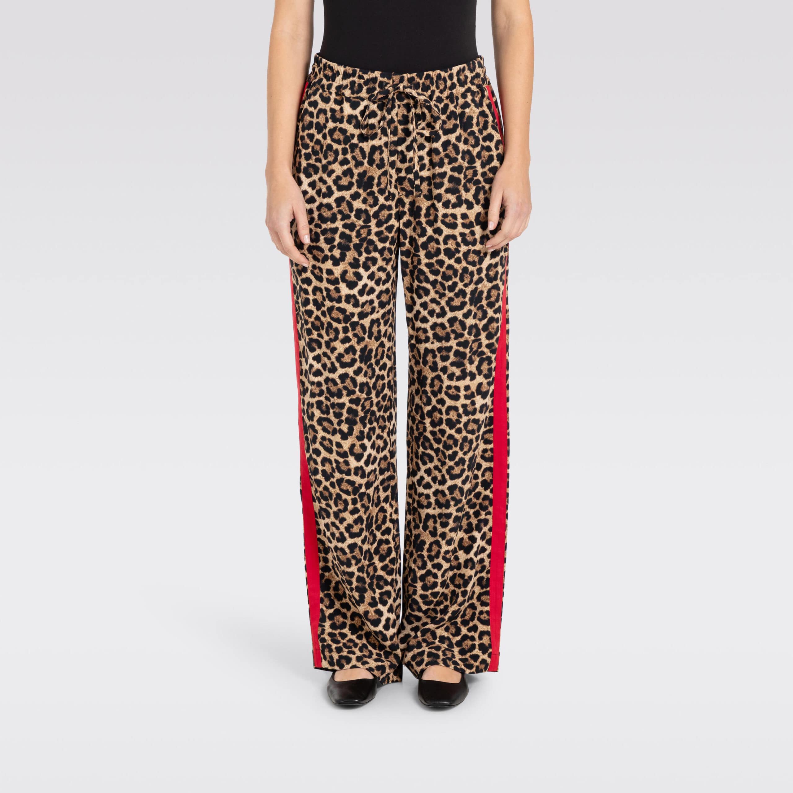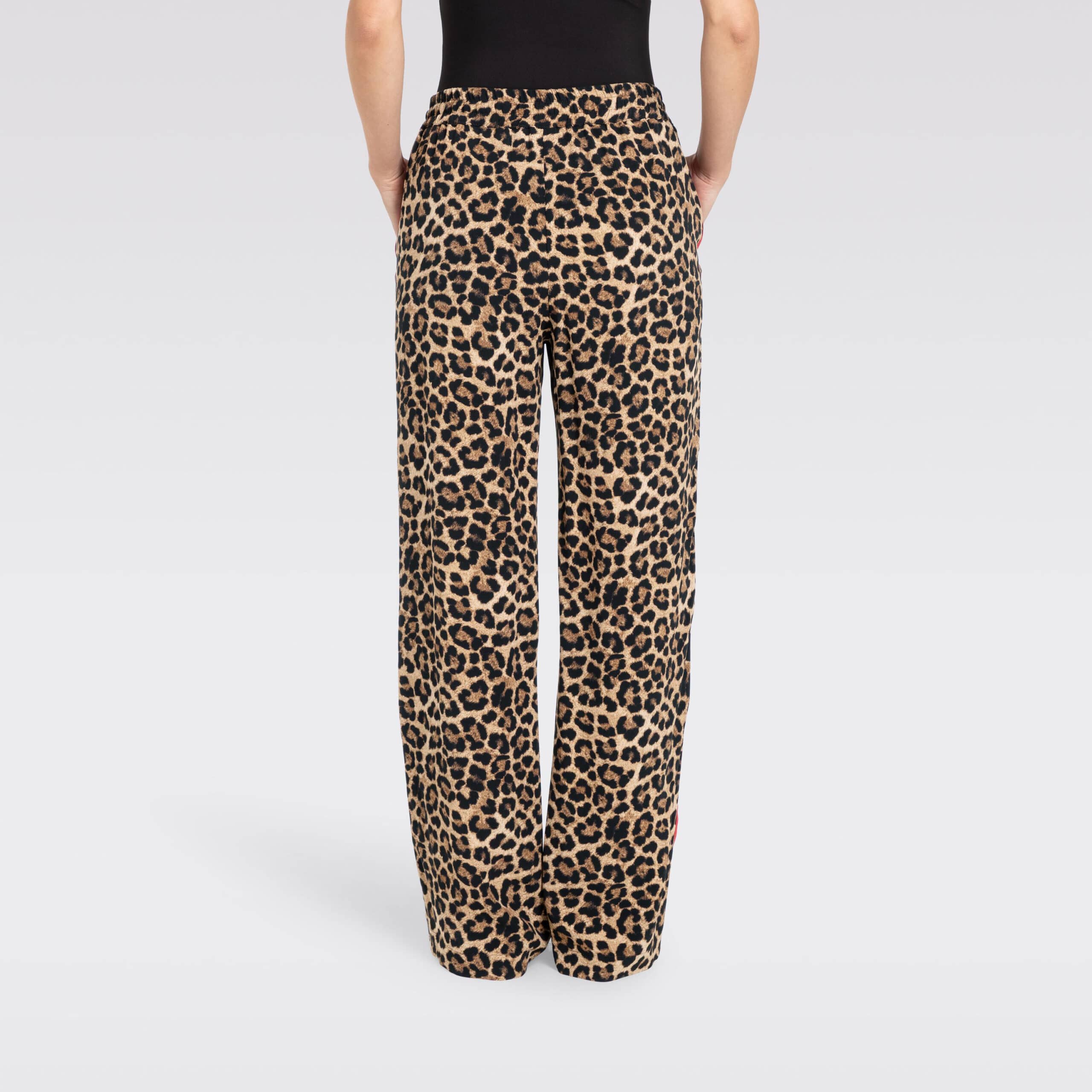 Luipaard pantalon van MAC, model Chiara summer galloon in walnut leo. Deze relaxte broek is gemaakt van een soepelvallende stof met luipaard print en een rode bies aan de zijkanten. De losvallende broek heeft een elastische taille met trekkoord, twee steekzakken en wijde, rechte broekspijpen.