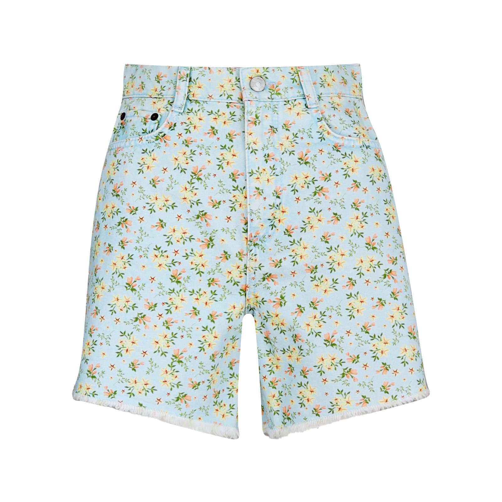 Lichtblauwe korte broek van MAC, model Shorty. Deze shorts is gemaakt van een denim stretch stof met bloemen, heeft een hoge taille en korte pijpen met fijne rafels. De korte broek sluit met een knoop- en ritssluiting, heeft twee steekzakken en twee achterzakken.