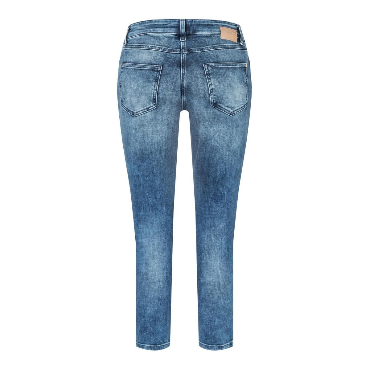Blauwe jeans van MAC x Sylvie Meis 24/7, model Mel feminine fit slim leg in blue authentic. Deze denim broek heeft een iets verhoogde smalle taille met een slim fit pasvorm. De jeans sluit met een knoop- en ritssluiting, heeft twee steekzakken en twee achterzakken.