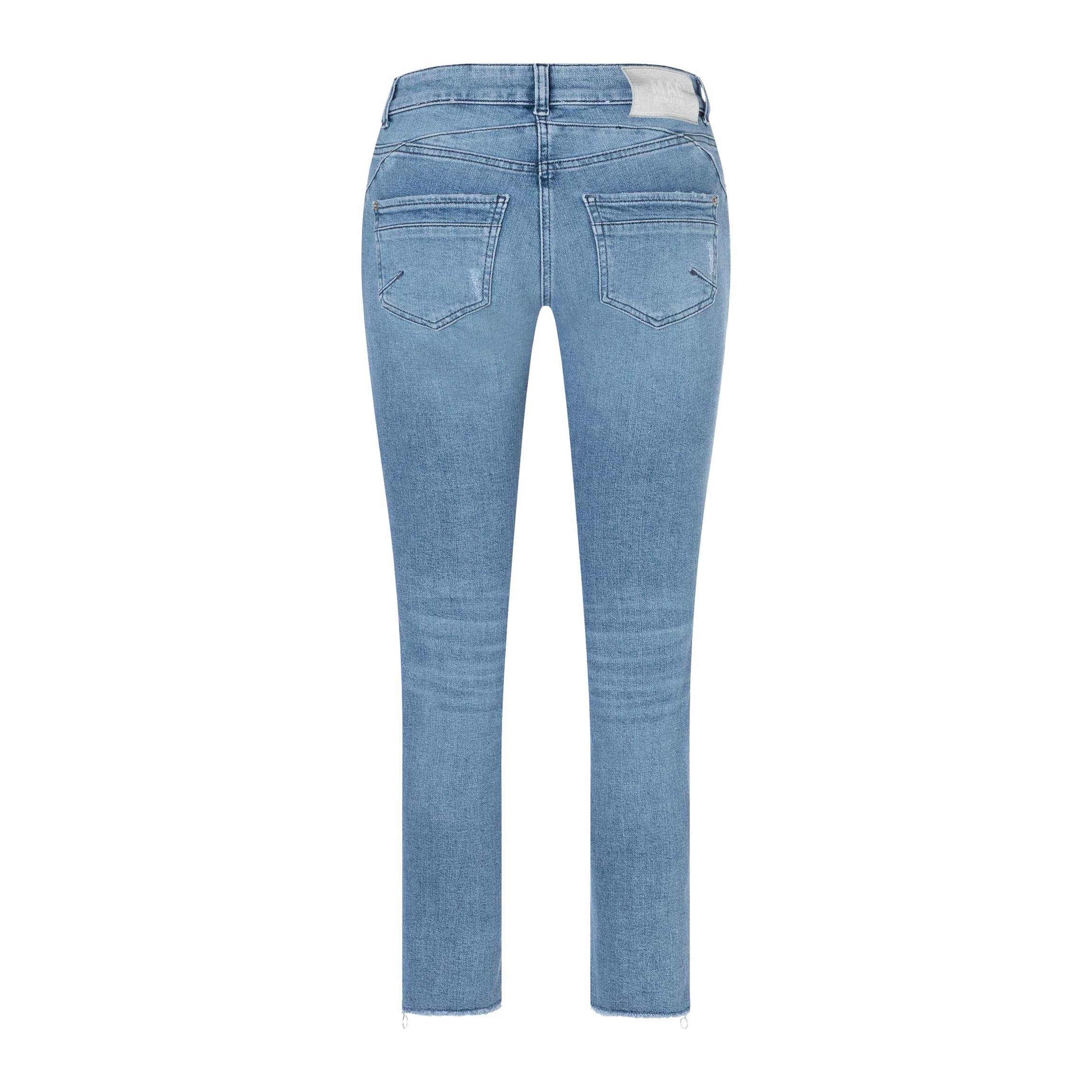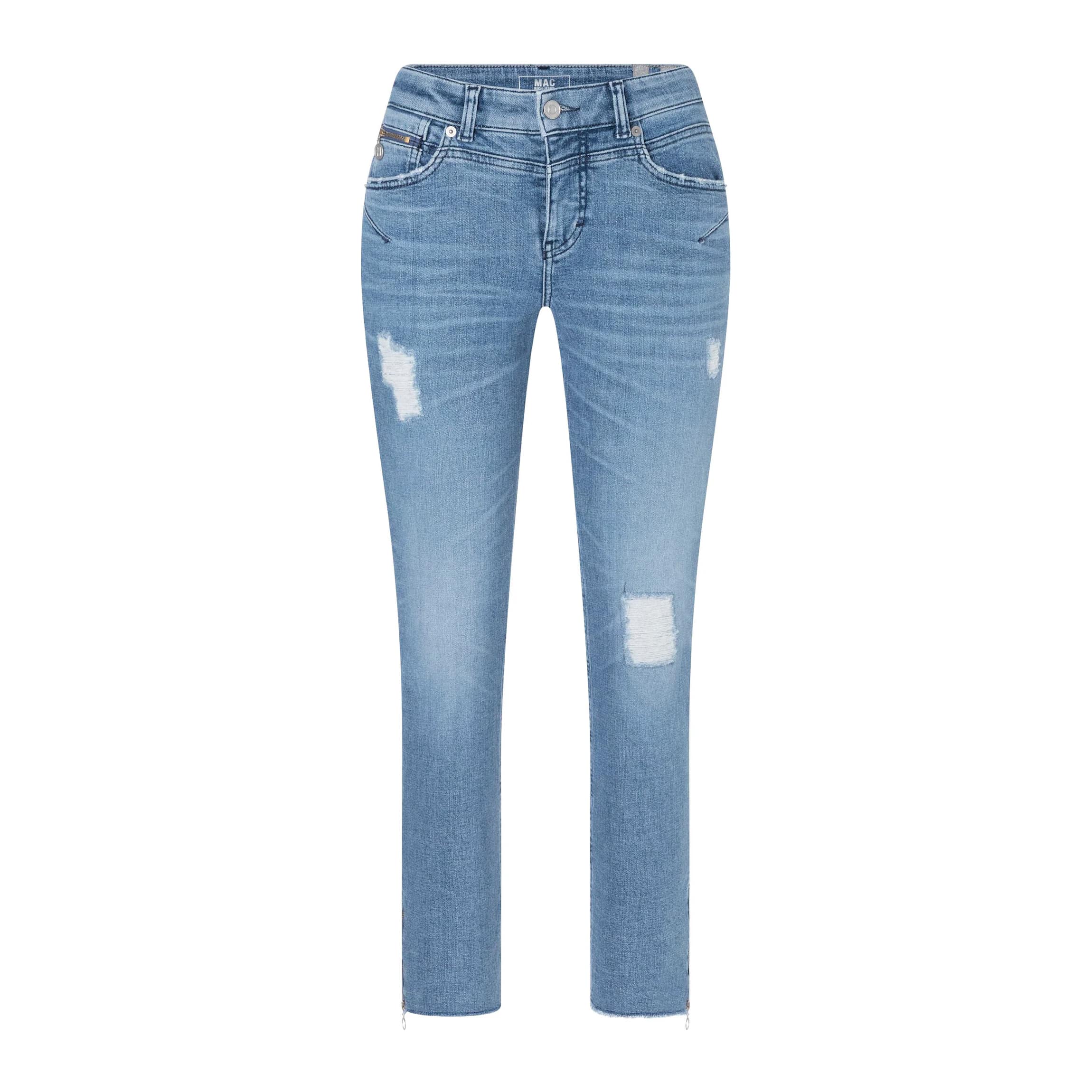 Blauwe jeans van MAC, model Rich Slim, straight fit, slim leg in destroyed summer blue wash. Deze 7/8 denim broek heeft een slim fit pasvorm met twee steekzakken aan de voorzijde en twee achterzakken. De spijkerbroek is gemaakt van een denim stretch stof met beschadigingen en sluit met een knoop- en ritssluiting. De onderzijde van de broekspijpen zijn fijn gerafeld.