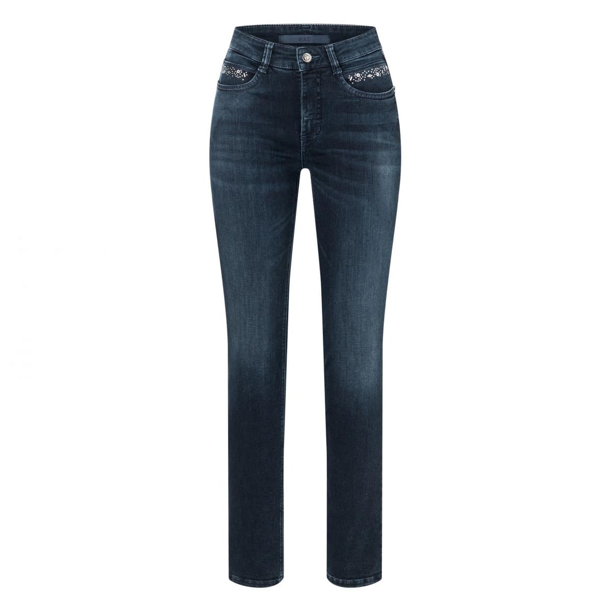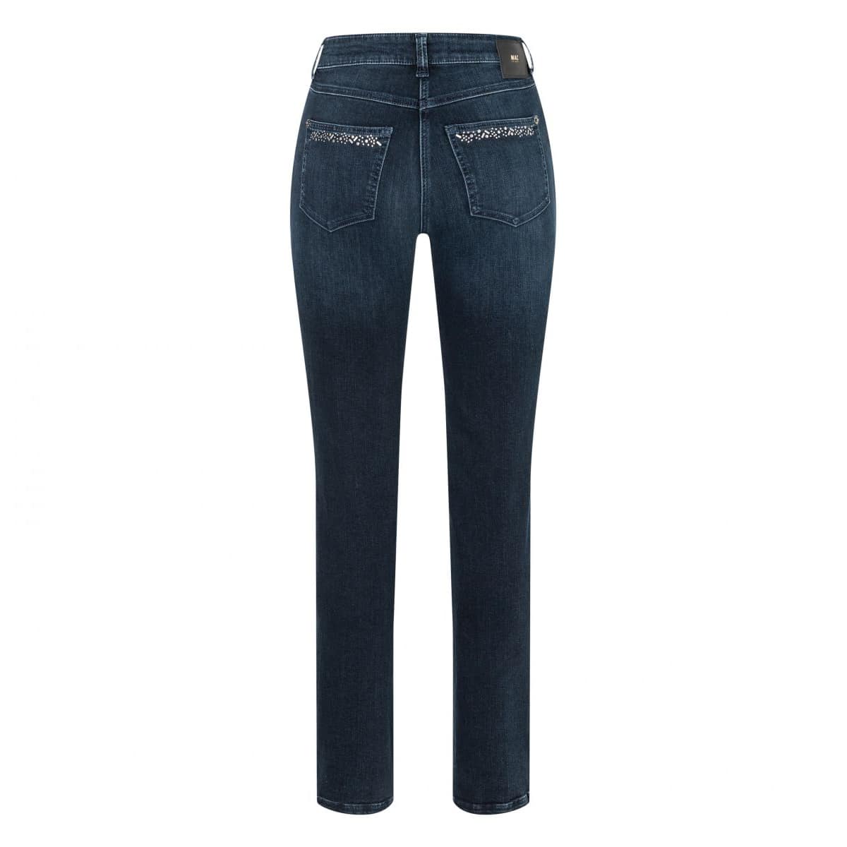 Donkerblauwe jeans van MAC, model Angela stars, straight leg in authentic dark blue used. Deze blauwe jeans is gemaakt van stretch denim en heeft een normale taille, slim fit pasvorm met rechte broekspijpen. De jeans sluit met een knoop- en ritssluiting en heeft twee steekzakken en twee achterzakken die versiert zijn met decoratieve studs.