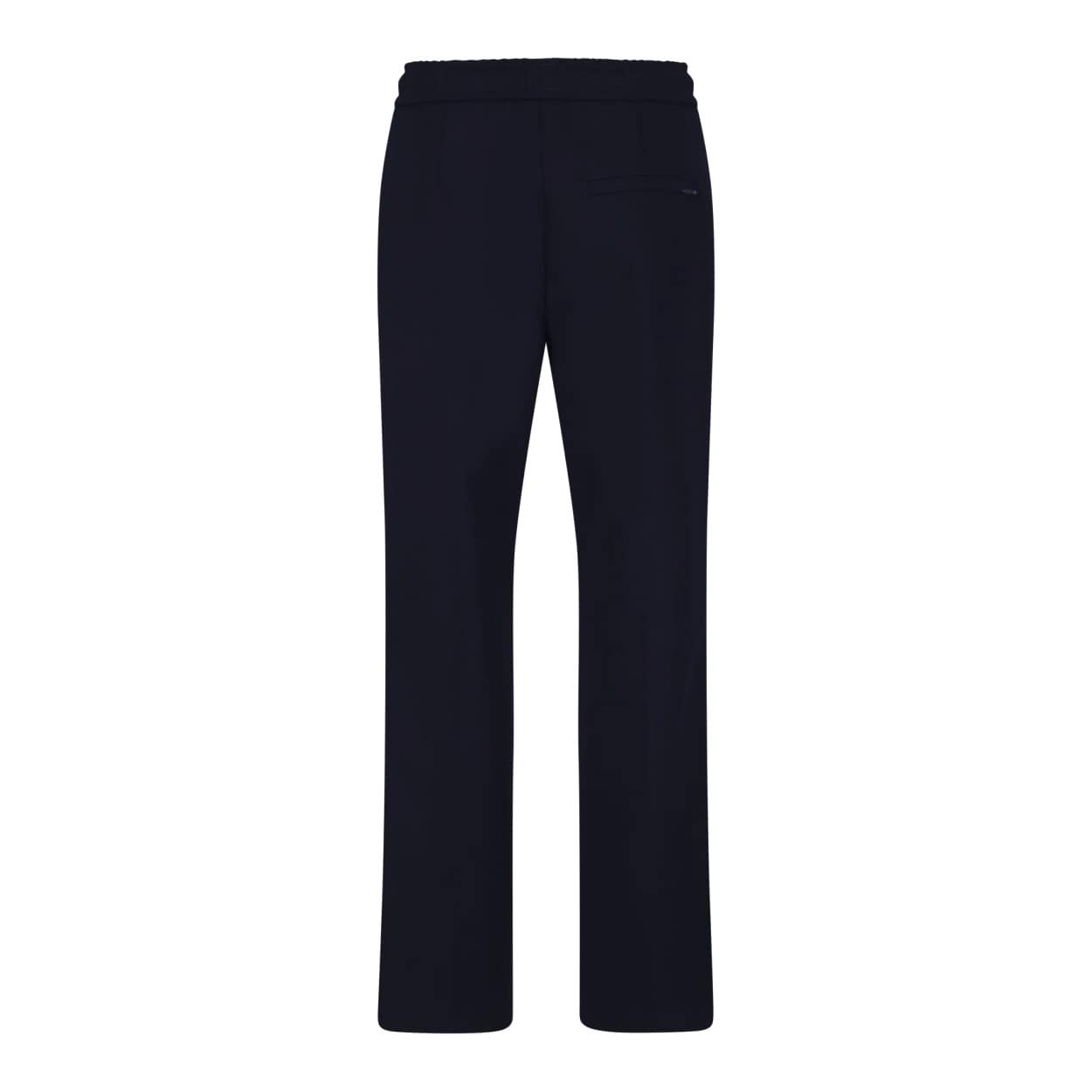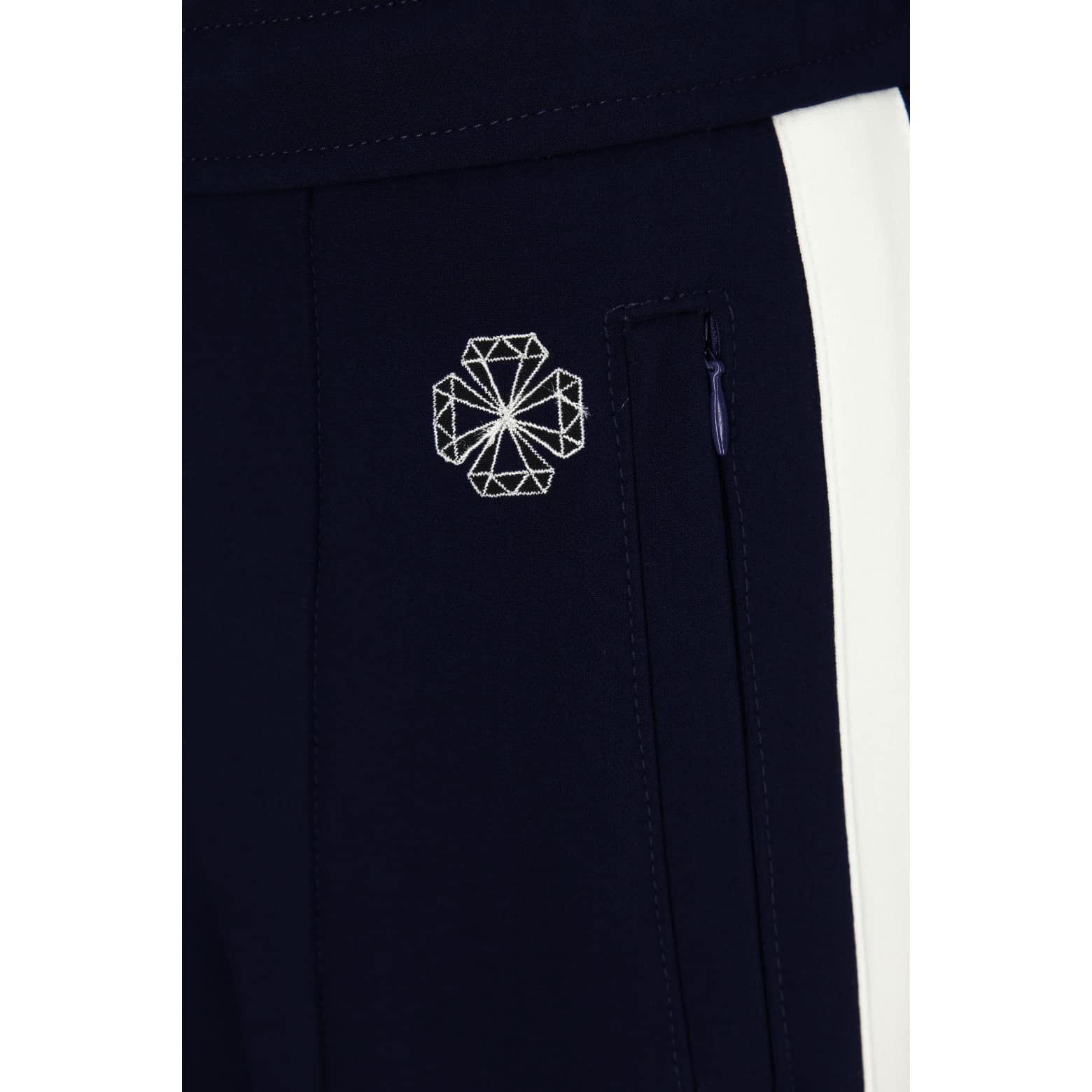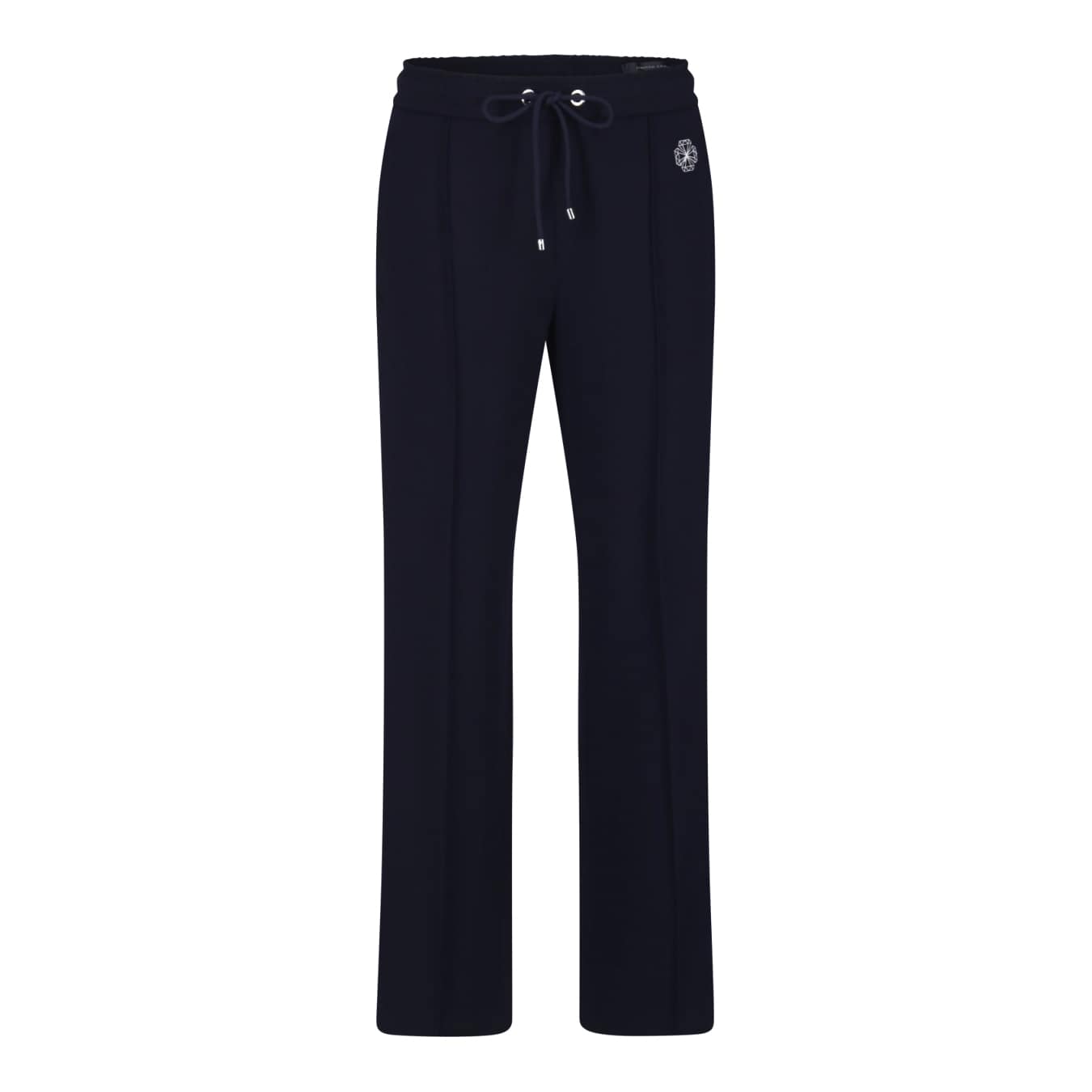 Donkerblauwe pantalon van MAC, model Chiara modern galloon. Deze relaxte broek is gemaakt van een effen donkerblauwe stof met aan de zijkant een witte bies en heeft rechte, wijde broekspijpen met een vaste naad aan de voorzijde. De losvallende broek heeft een elastische taille met trekkoord, twee steekzakken en twee paspelzakken met ritsjes.