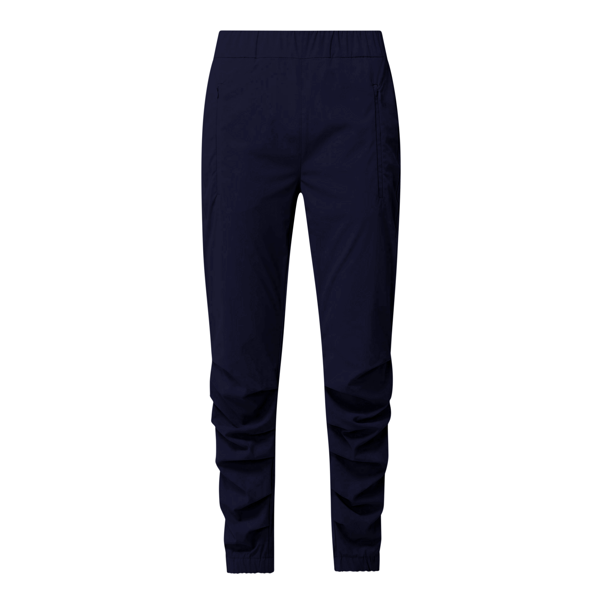 Donkerblauwe pantalon van MAC, model Daydream Motion flow. Deze broek is gemaakt van een dunne effen donkerblauwe stretch stof en is aan de onderzijde van de broekpijpen geplooid. De pantalon heeft een elastische tailleband, twee zakken achter ritsjes en achterzakken.