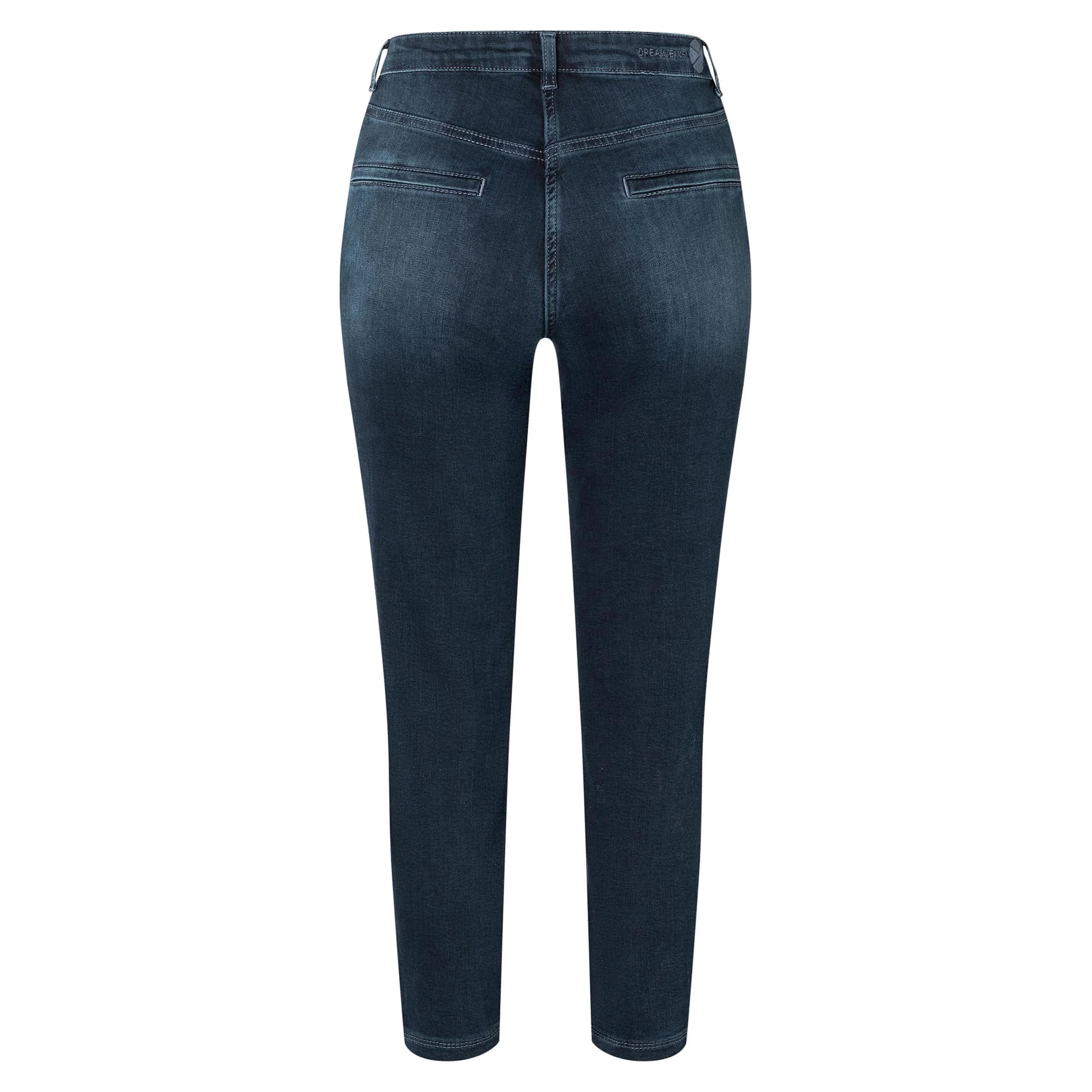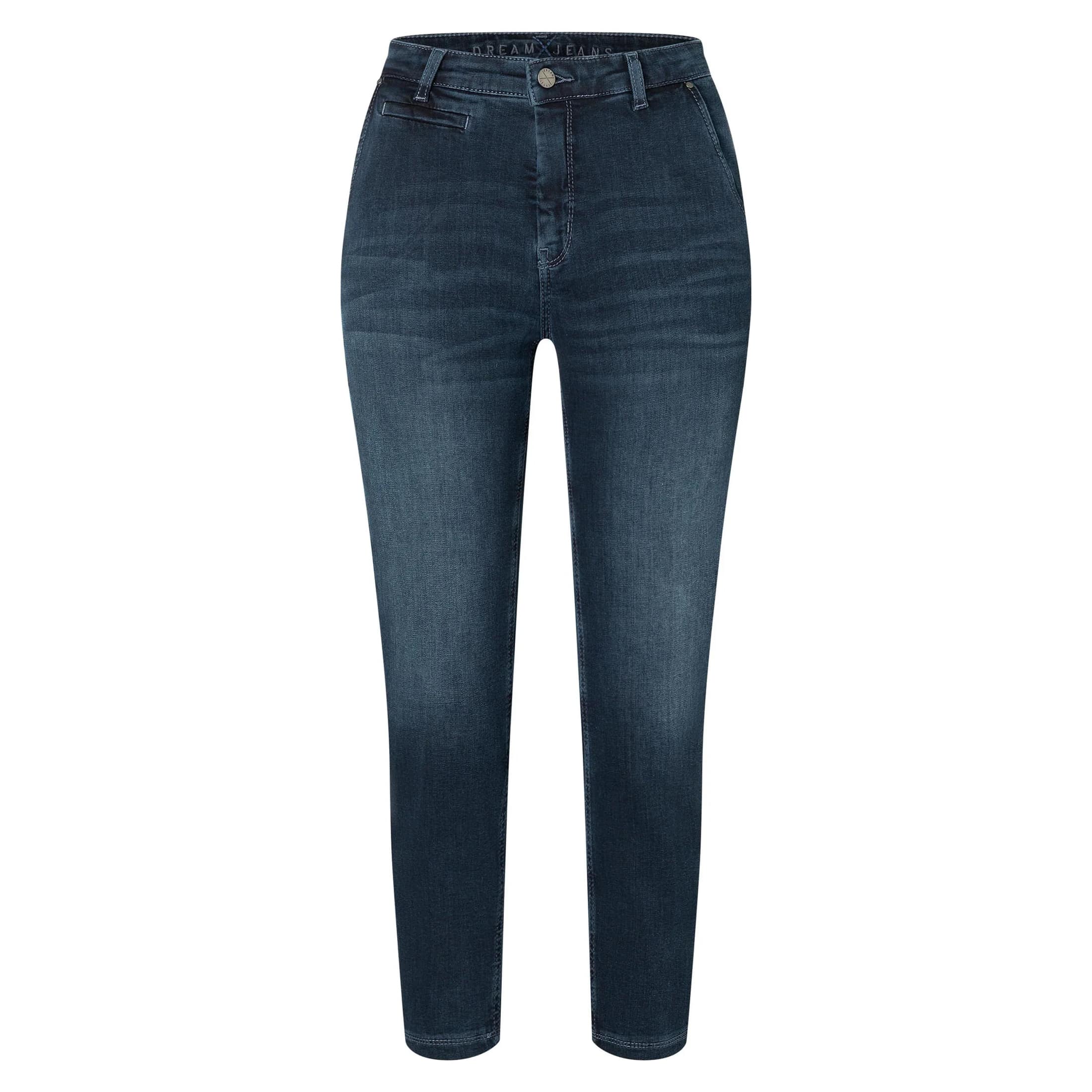 Chino jeans van MAC, model Dream chino in fancy night blue. Deze blauwe spijkerbroek is gemaakt van stretch denim, heeft een hogere taille en toelopende broekspijpen. De jeans sluit met een knoop- en ritssluiting en heeft twee steekzakken en twee sier paspelzakken.