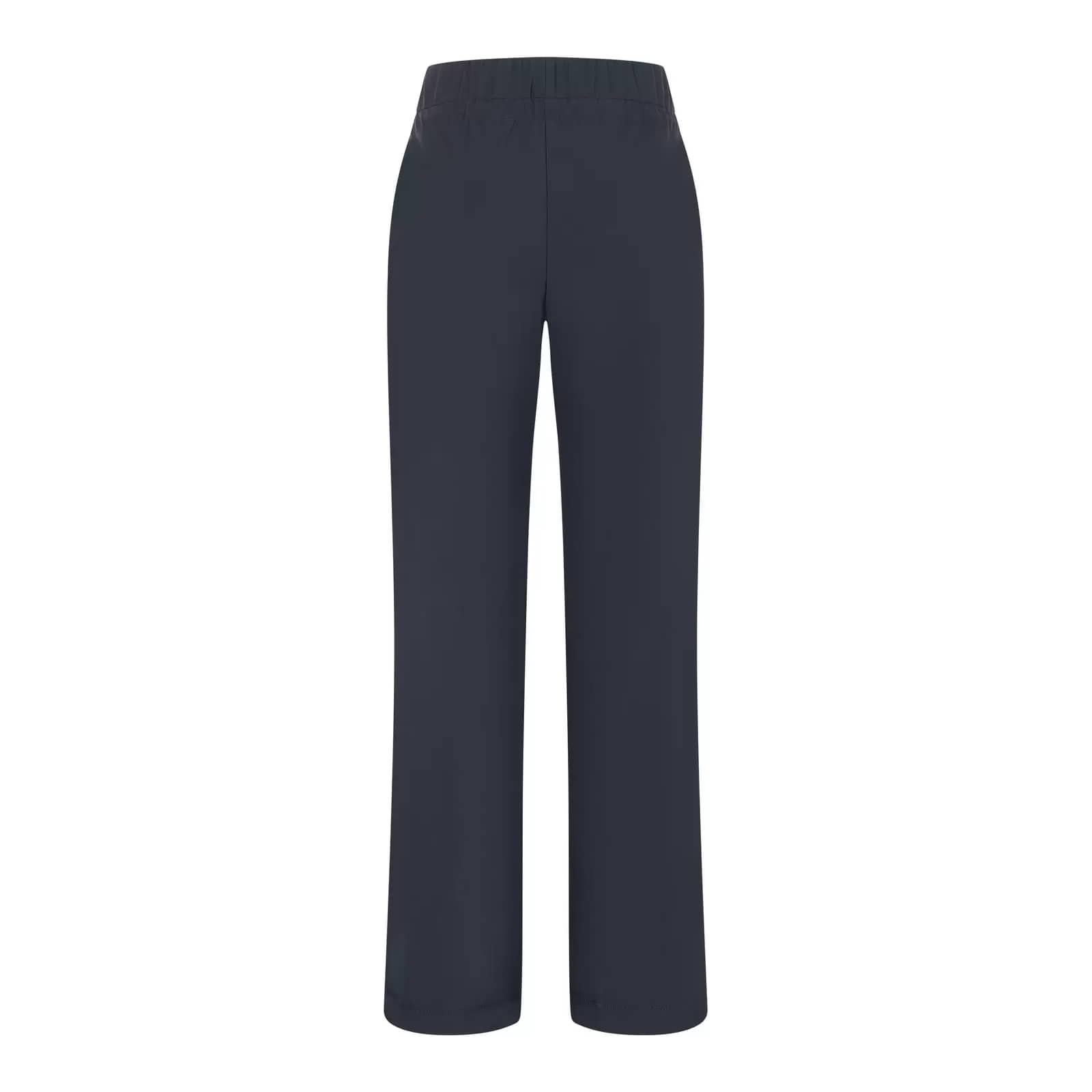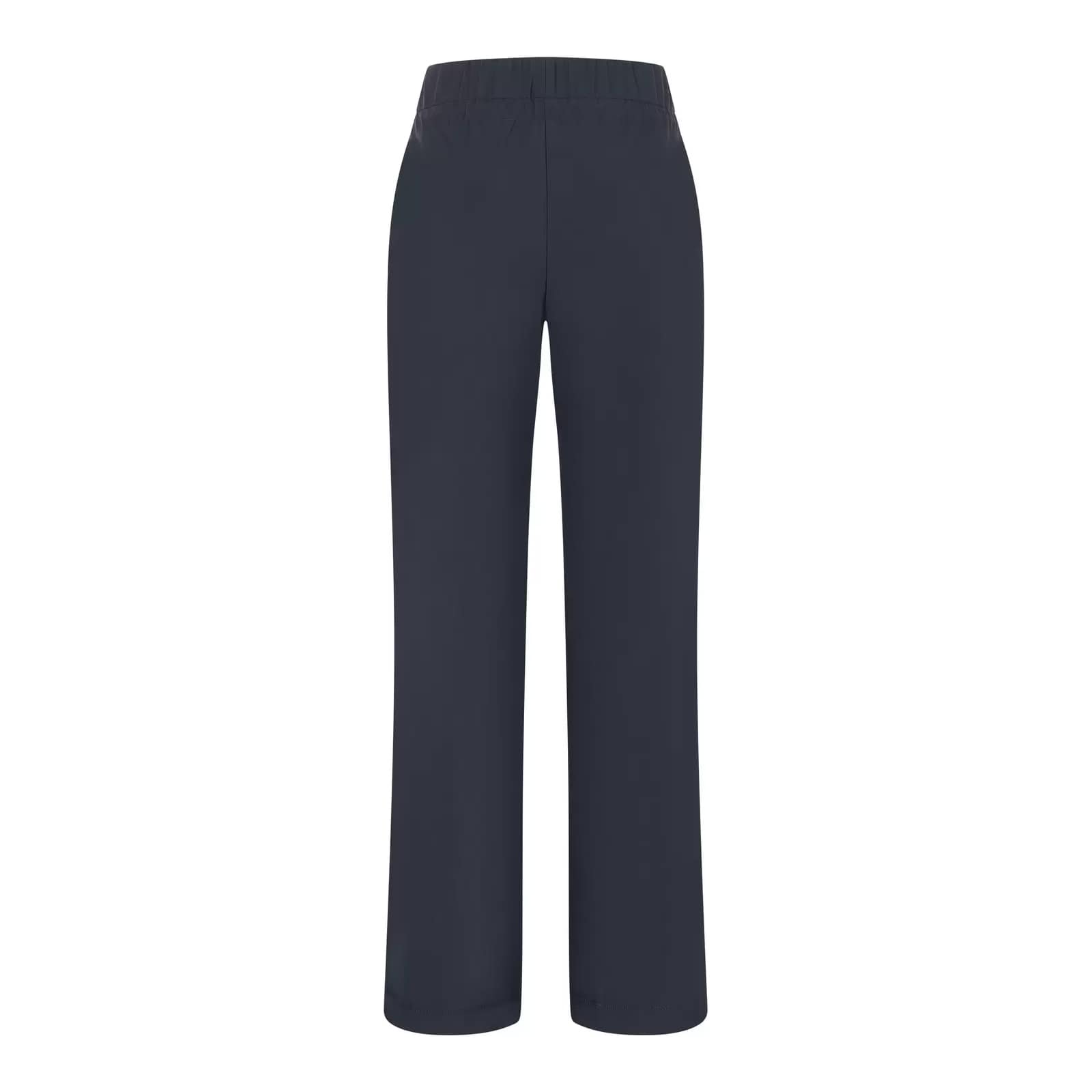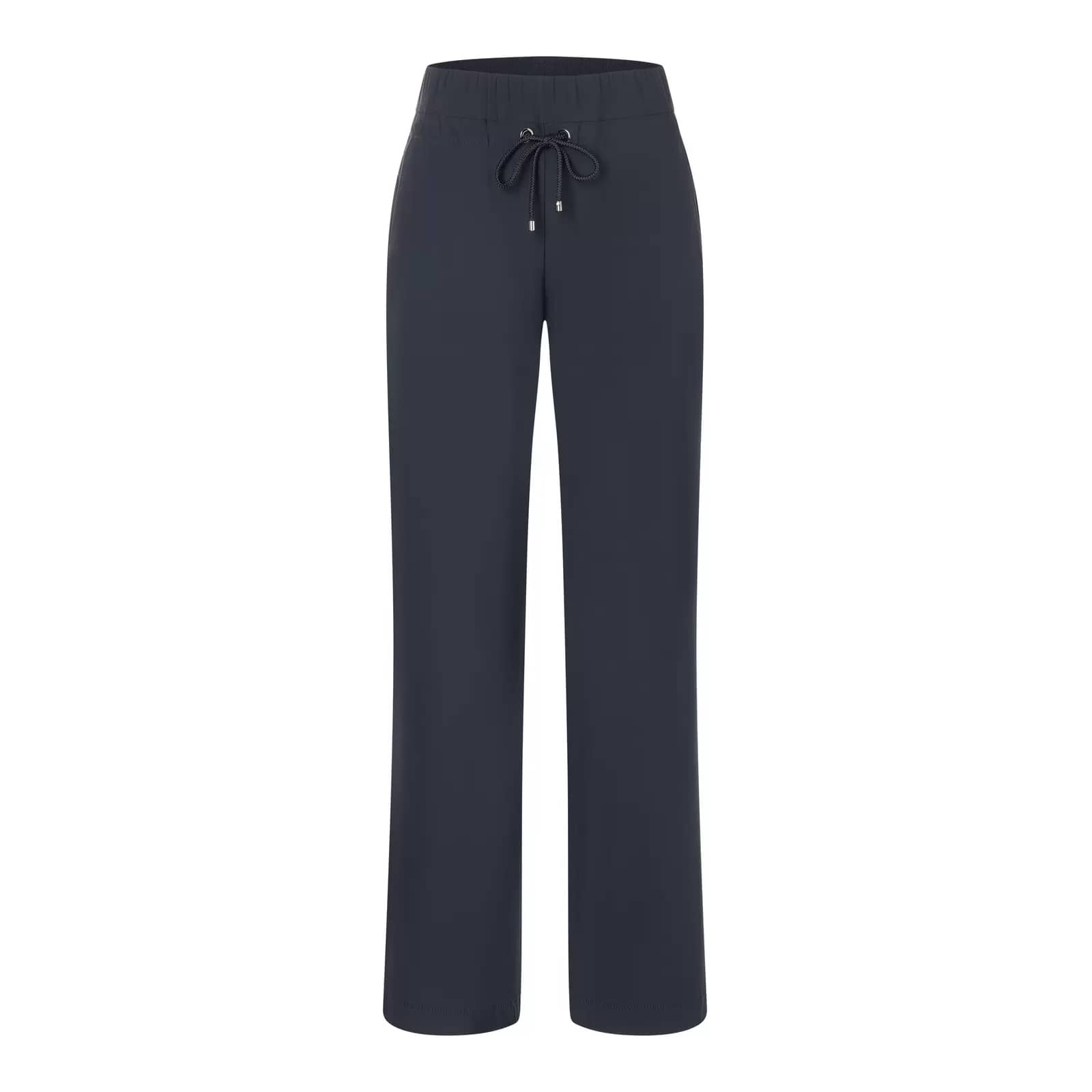 Donkerblauwe pantalon van MAC, model Easy wideleg. Deze relaxte broek is gemaakt van een gladde, premium techno stretch stof en heeft rechte, wijde broekspijpen. De losvallende broek heeft een elastische taille met trekkoord en twee steekzakken.