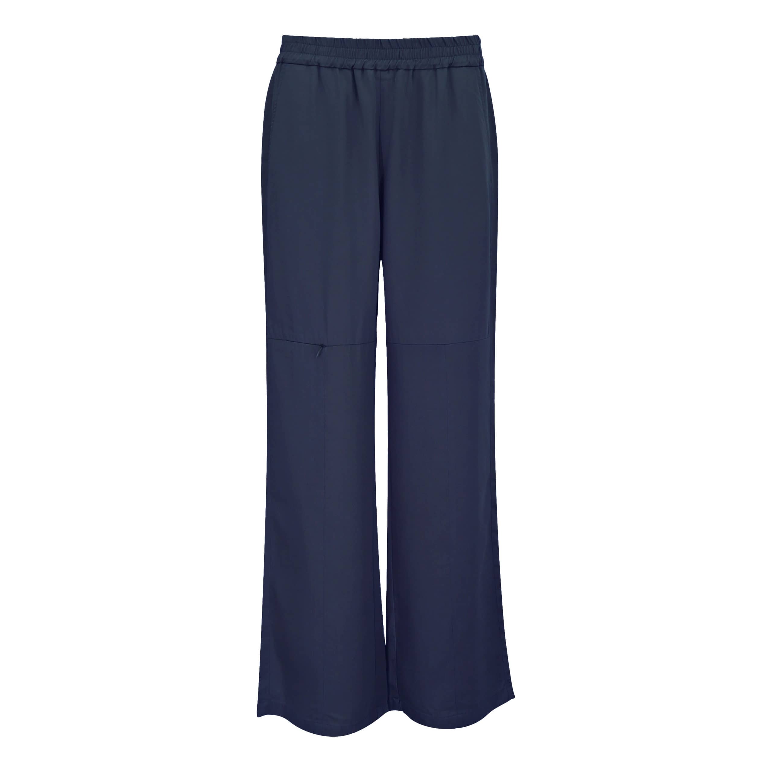 Wijde pantalon van MAC, model Esther. Deze relaxte pantalon is gemaakt van lyocell en heeft een effen donkerblauwe kleur. De losvallende broek heeft een hoge elastische taille, wijde broekspijpen, twee steekzakken, twee achterzakken en een klein ritsje op het bovenbeen met daarachter een zak.