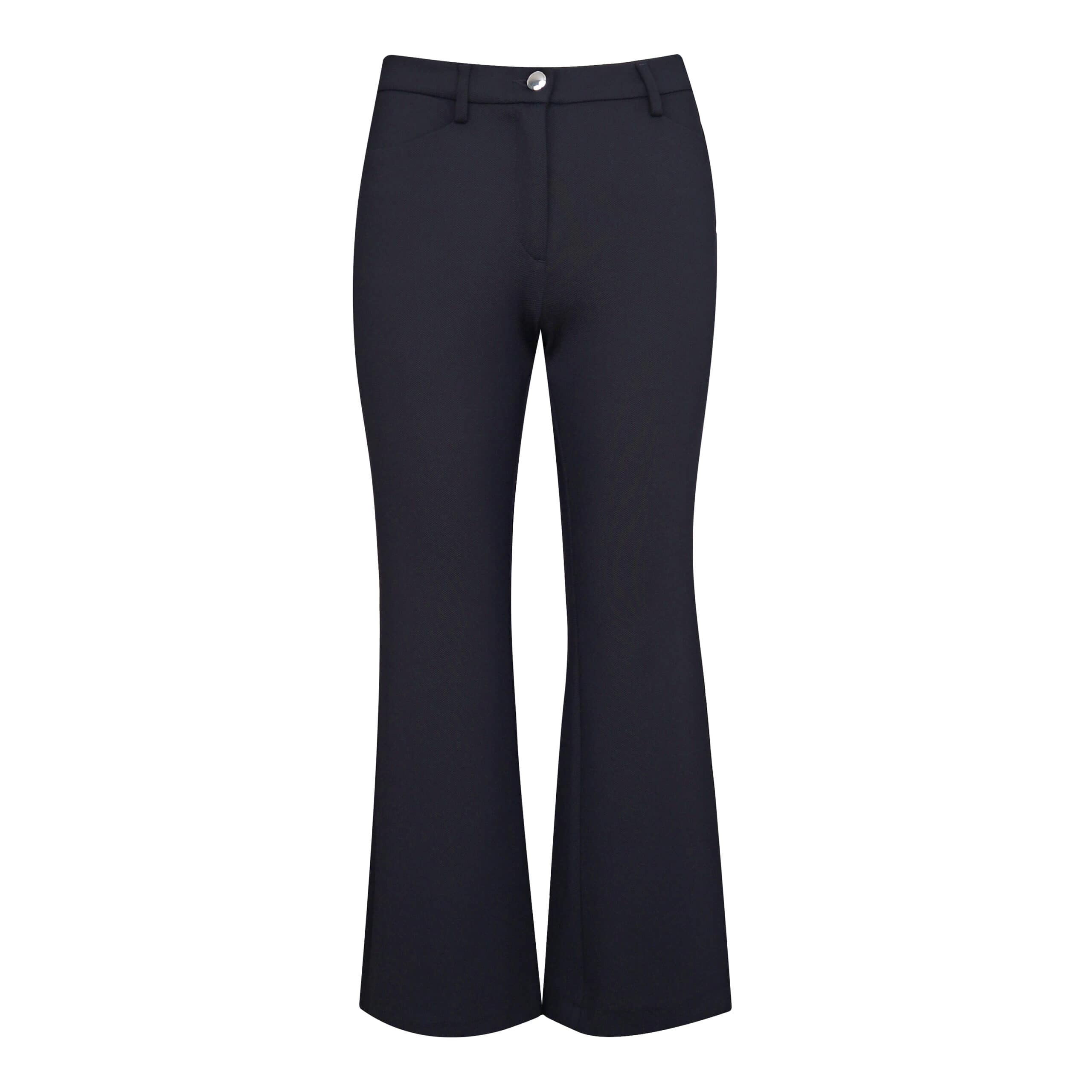 Donkerblauwe pantalon van MAC, model Bella. Deze pantalon is gemaakt van donkerblauwe, soepelvallende stretch stof met relief en heeft een slim fit pasvorm met uitlopende broekspijpen. De broek sluit met een knoop- en ritssluiting, heeft een hoge taille, twee steekzakken en sier paspelzakjes.
