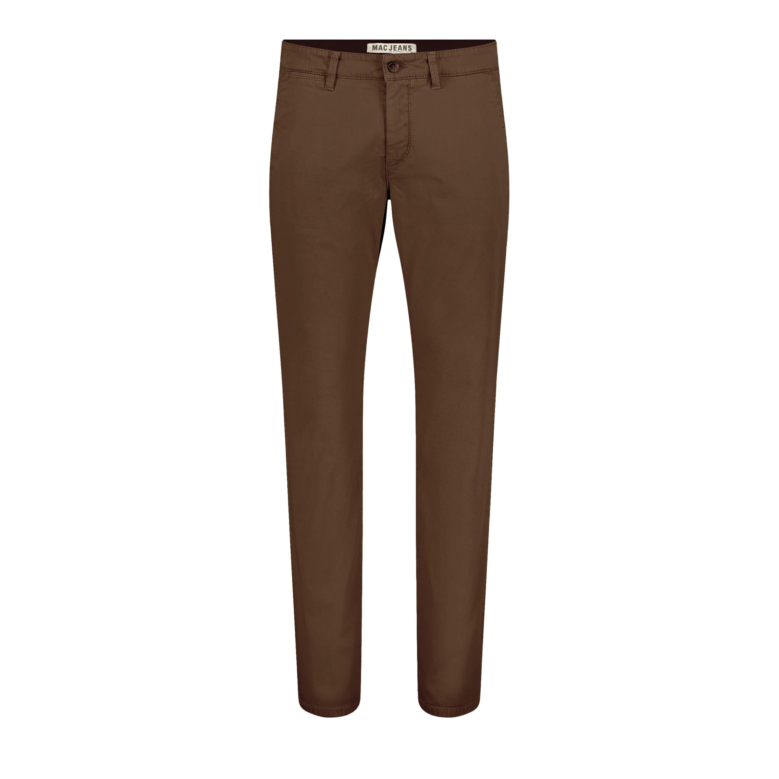 Donkerbruine pantalon van MAC, model Lennox. Deze broek is gemaakt van katoenen stretch stof en heeft een modern fit met een rechte, smalle broekspijp. De pantalon sluit met een knoop- en ritssluiting, heeft twee steekzakken en twee achterzakken.