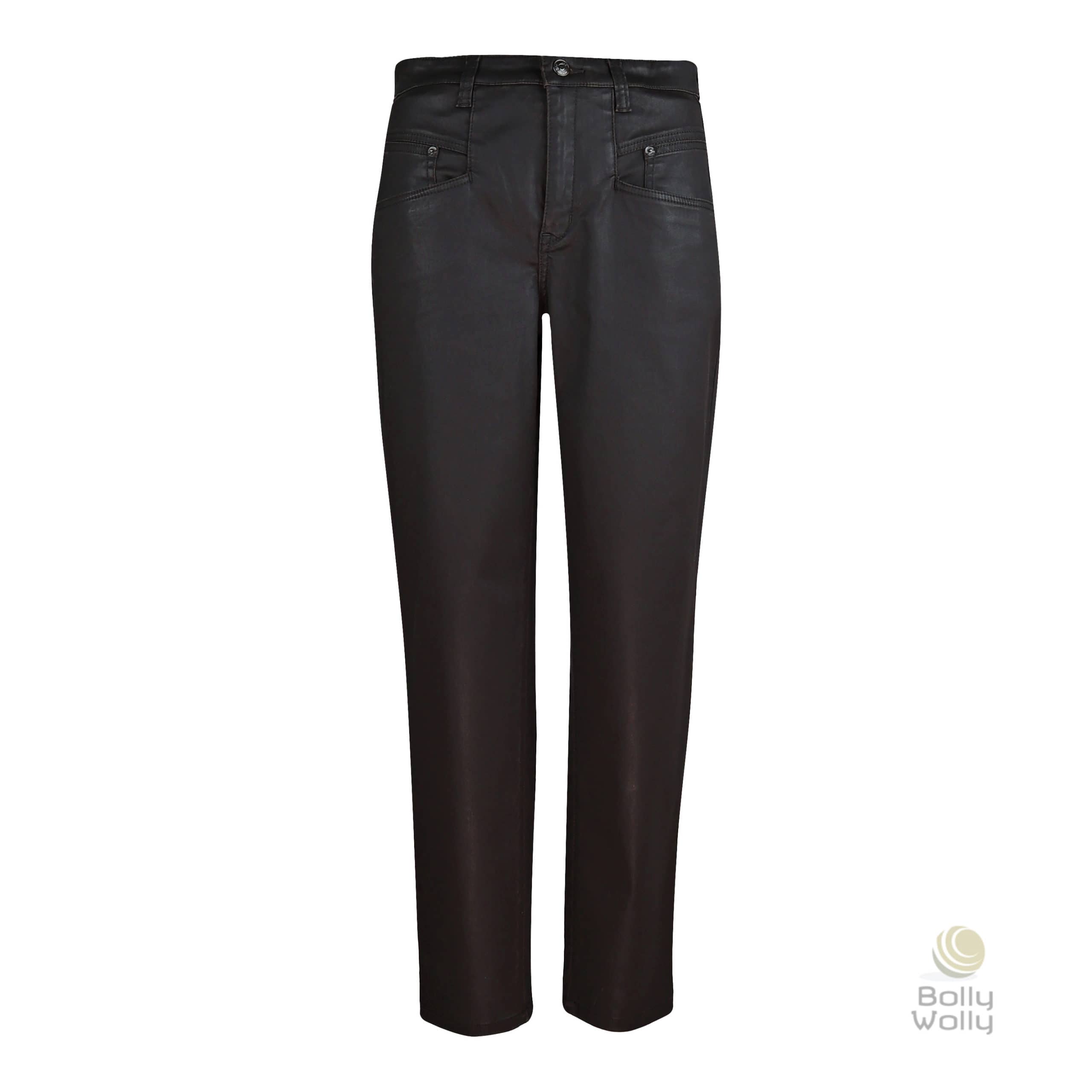 Mom fit jeans van MAC, model Rich Carrot, highwaist carrot. Deze donkerbruine broek is gemaakt van stretch denim met een coating, heeft een hoge taille en toelopende broekspijpen. De jeans sluit met een knoop- en ritssluiting en heeft twee steekzakken en twee achterzakken.