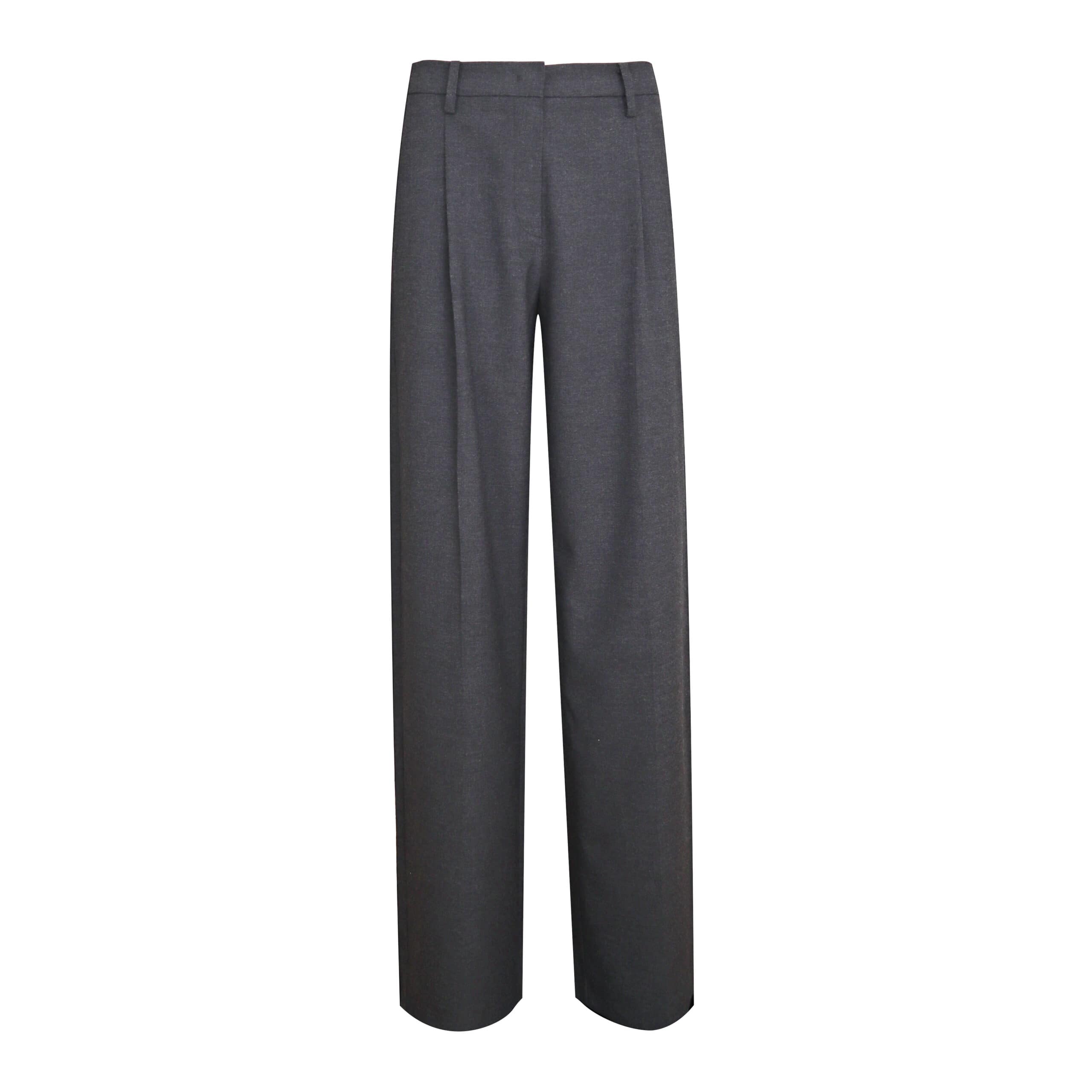 Donkergrijze pantalon van MAC, model Chaja. Deze pantalon is gemaakt van een donkergrijze grijze stof met een wol-look en heeft rechte wijde broekspijpen. De lange broek sluit met een haakje, knoop- en ritssluiting, heeft een elastische tailleband aan de achterzijde, hoge taille en twee steekzakken.