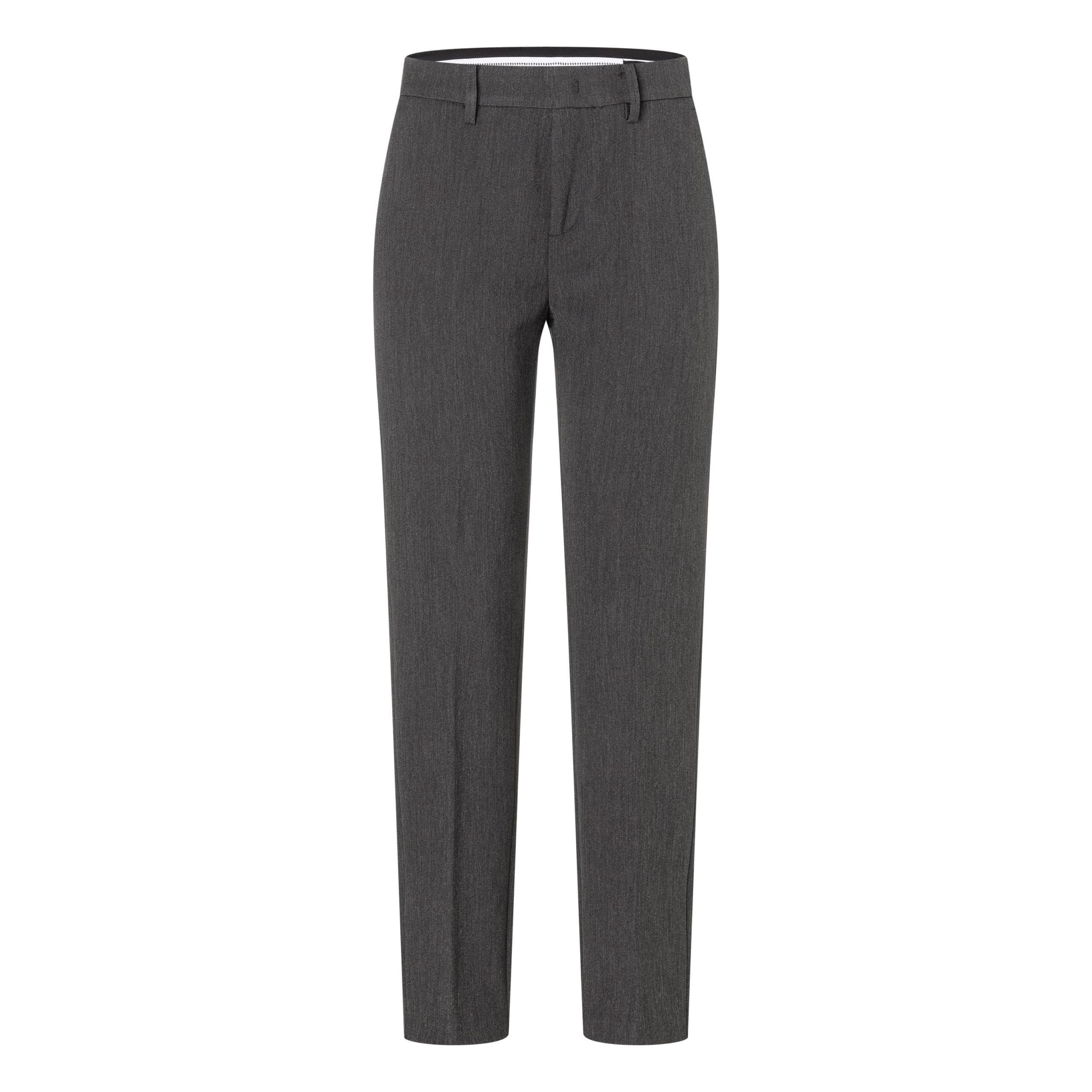 Jersey pantalon van MAC, model Chia in earl grey melange. Deze donkergrijze pantalon is gemaakt van stretch stof met wol look en heeft toelopende broekspijpen. De broek sluit met een haakje, knoop- en ritssluiting, heeft twee steekzakken en twee sier paspelzakken.