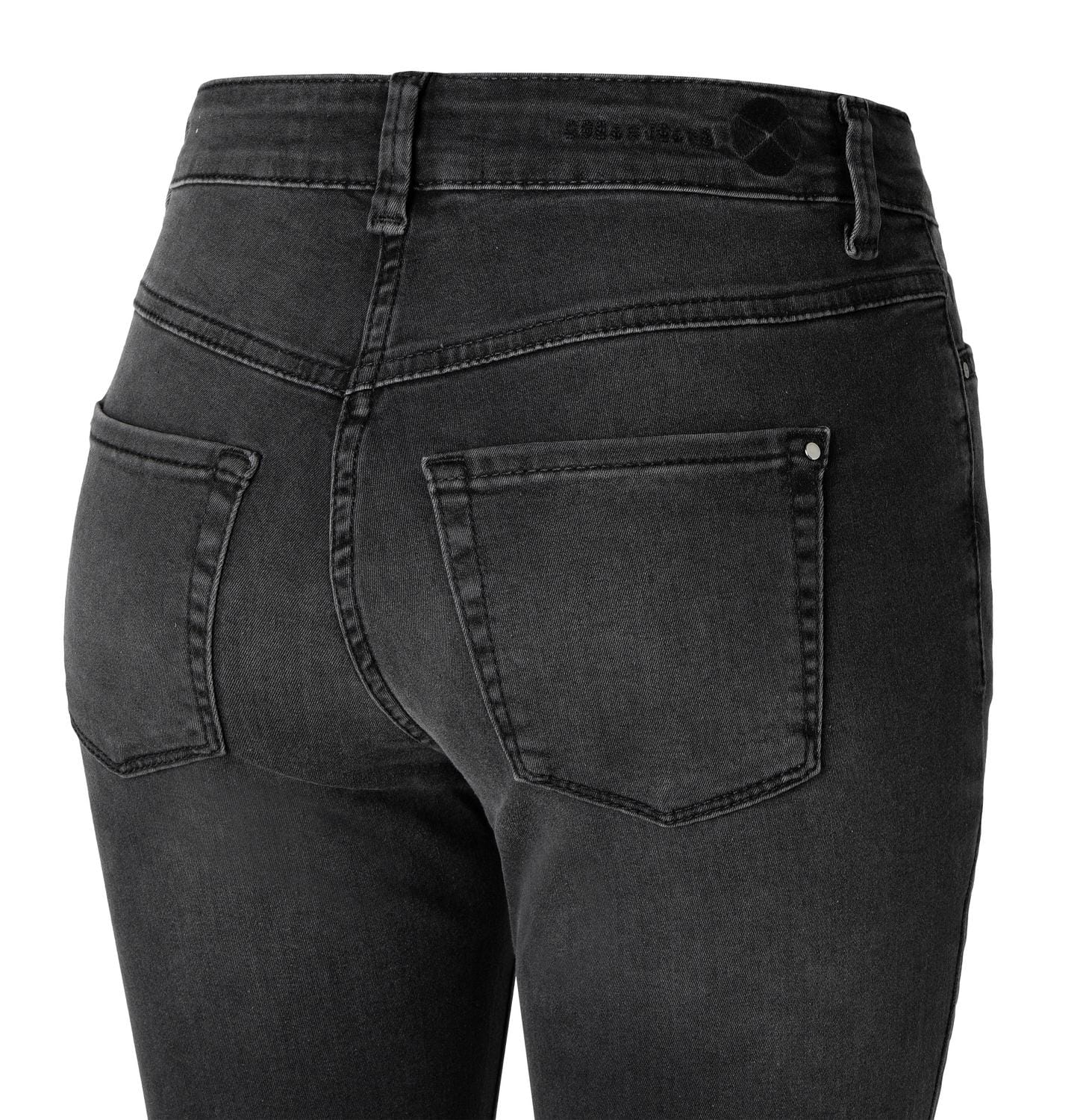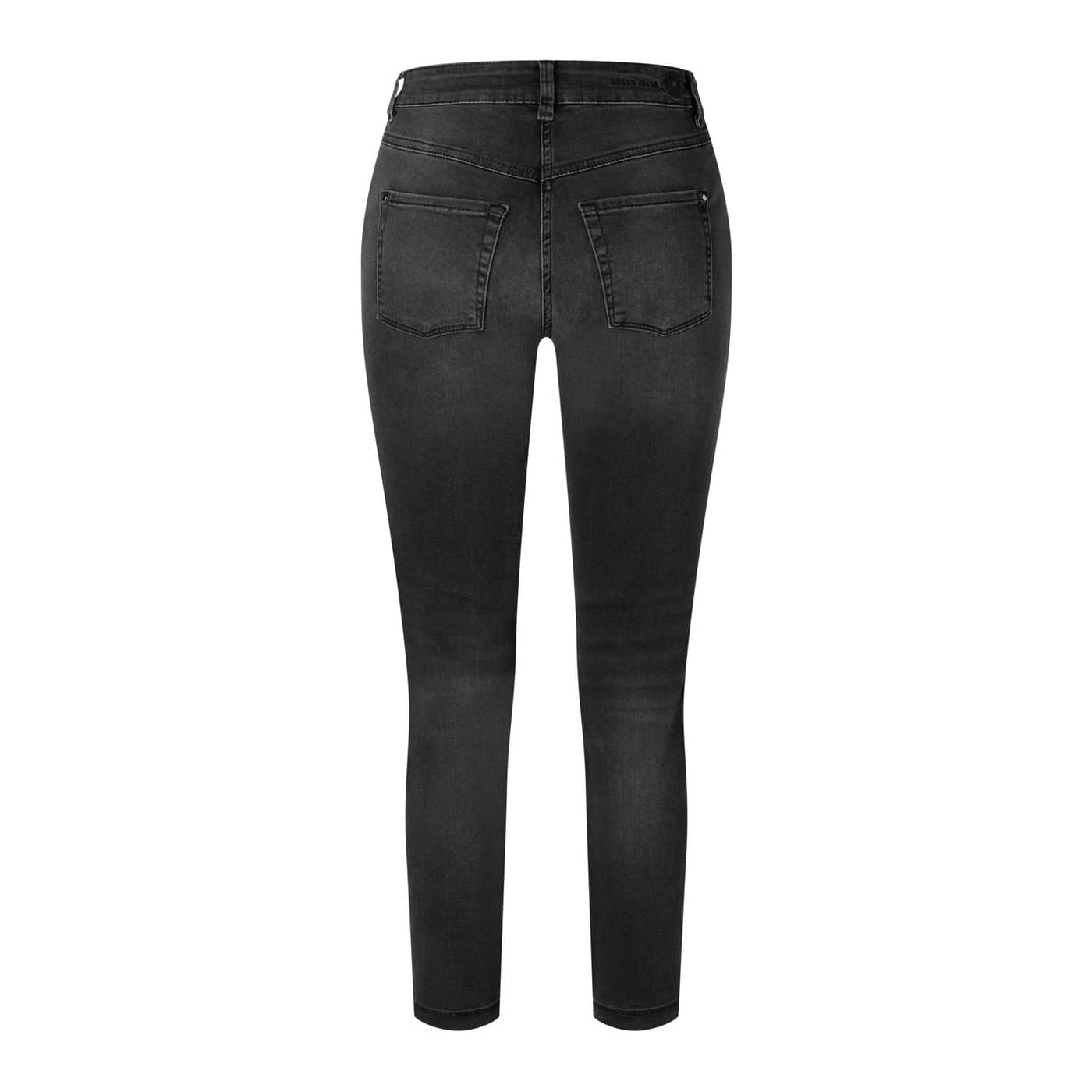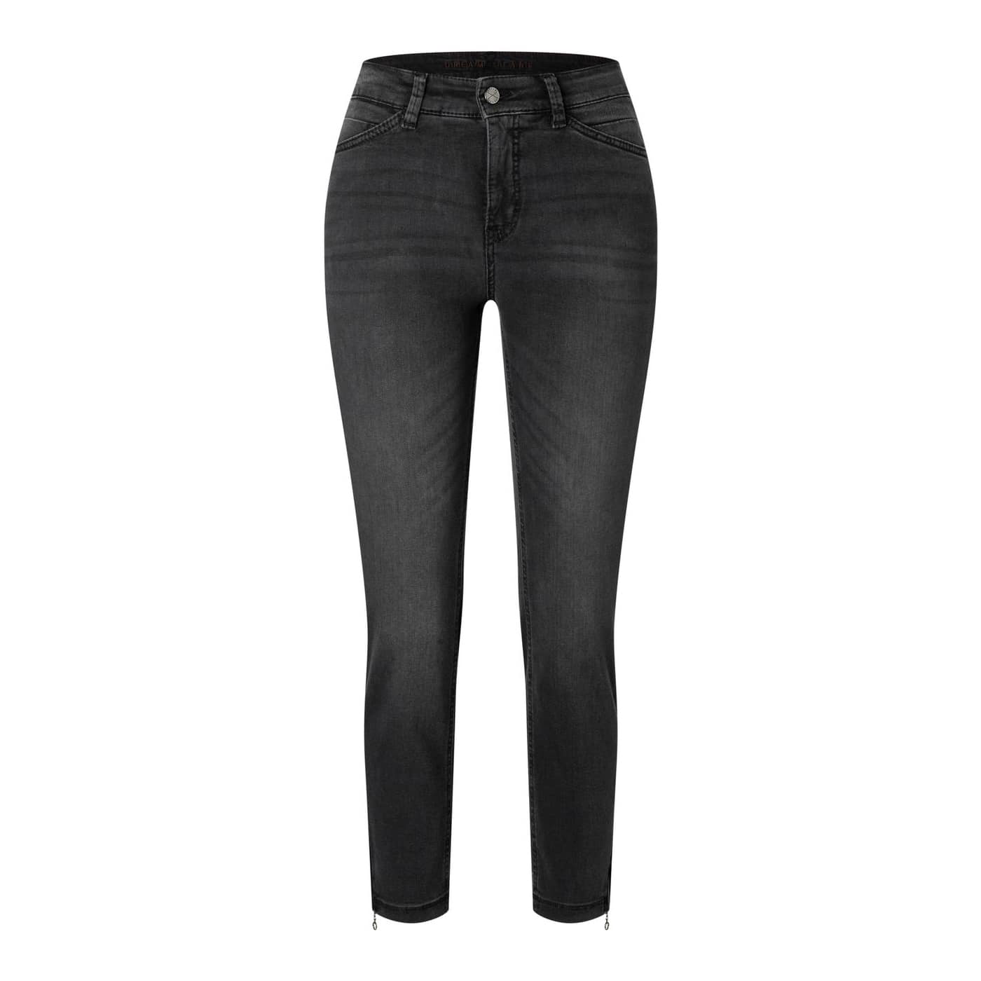 Donkergrijze jeans van MAC Jeans, model Dream Chic, slim leg in antra fancy wash. Deze broek is gemaakt van stretch denim en heeft een normale taille met slim fit pasvorm. De jeans sluit met een knoop- en ritssluiting, heeft twee steekzakken, twee achterzakken en ritsjes onderaan de broekspijpen.