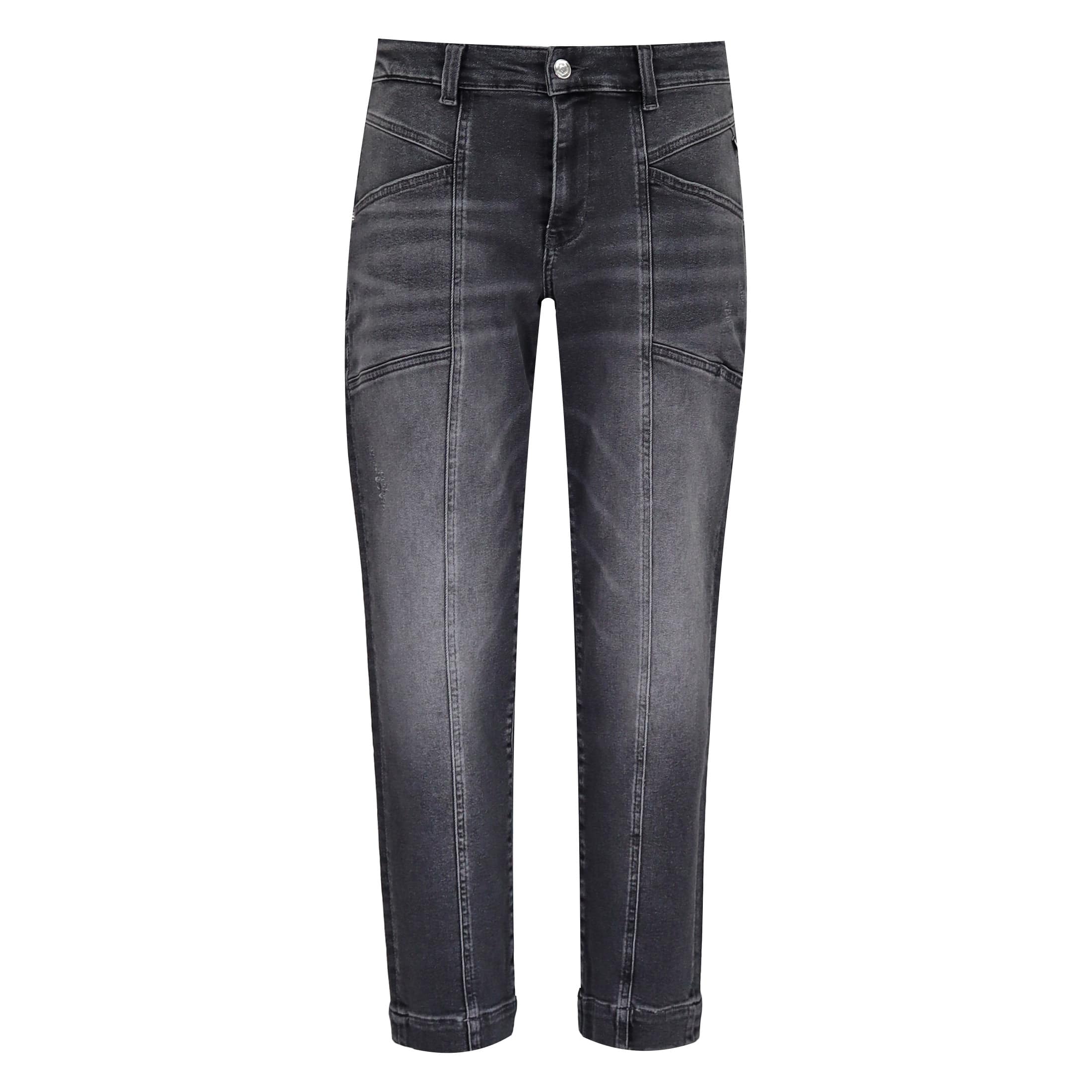 Donkergrijze jeans van MAC, model Rich Mila, highwaist, carrot. Deze broek is gemaakt van stretch denim met used wassing, heeft een hoge taille en een moms fit met toelopende broekspijpen. De jeans sluit met een knoop- en ritssluiting, heeft twee steekzakken en twee achterzakken.