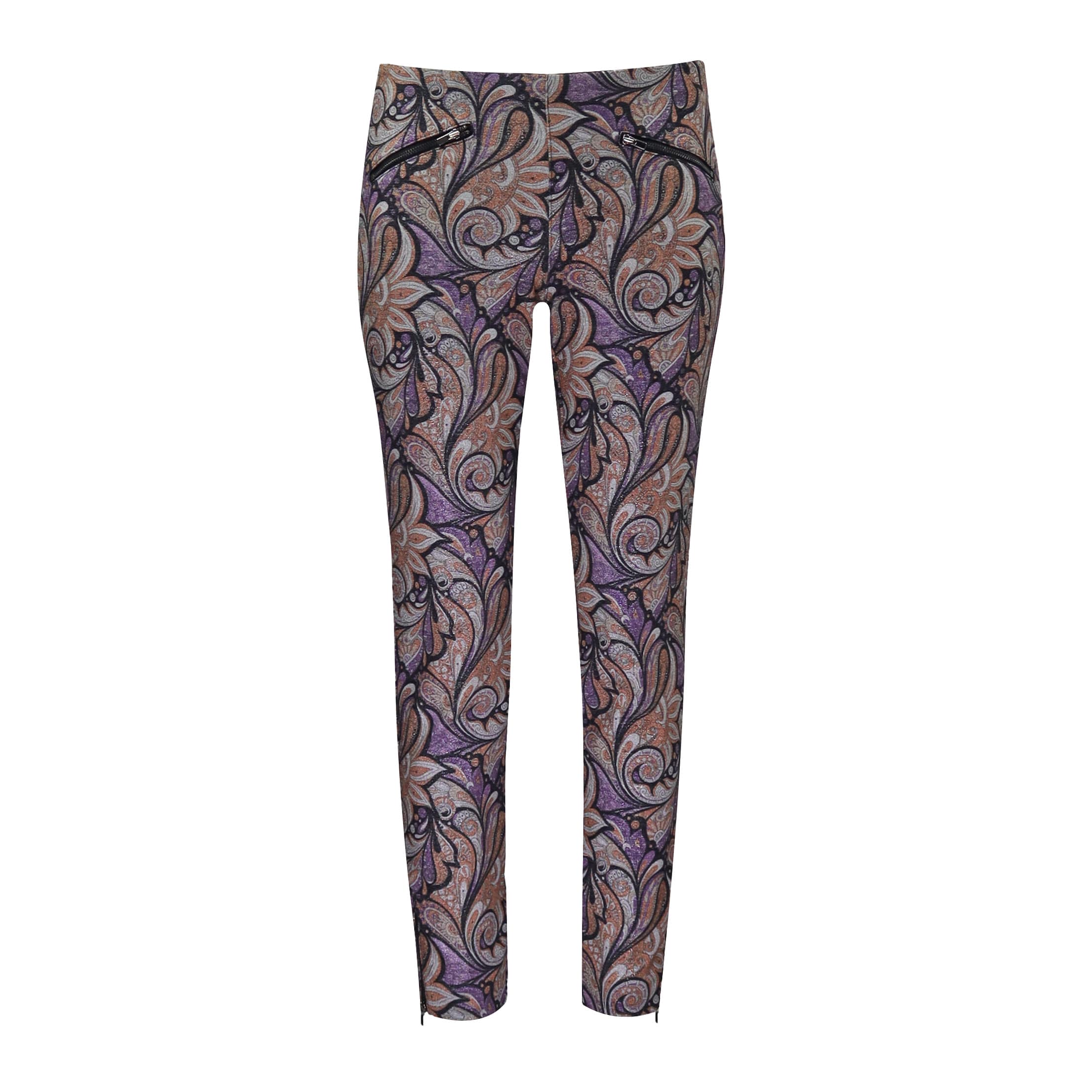 Stretch broek van MAC, model Dream Ankle luxury. Deze broek is gemaakt van een metalic stretch stof met een paisley print, heeft een aansluitende pasvorm met een elastische tailleband. In deze elastische tailleband zit aan de zijkant een verborgen ritssluiting met een knoop. De broek is gemaakt van een stretch stof met aan de voorzijde twee steekzakjes met aan de onderzijde van de broekspijpen kleine ritsjes.